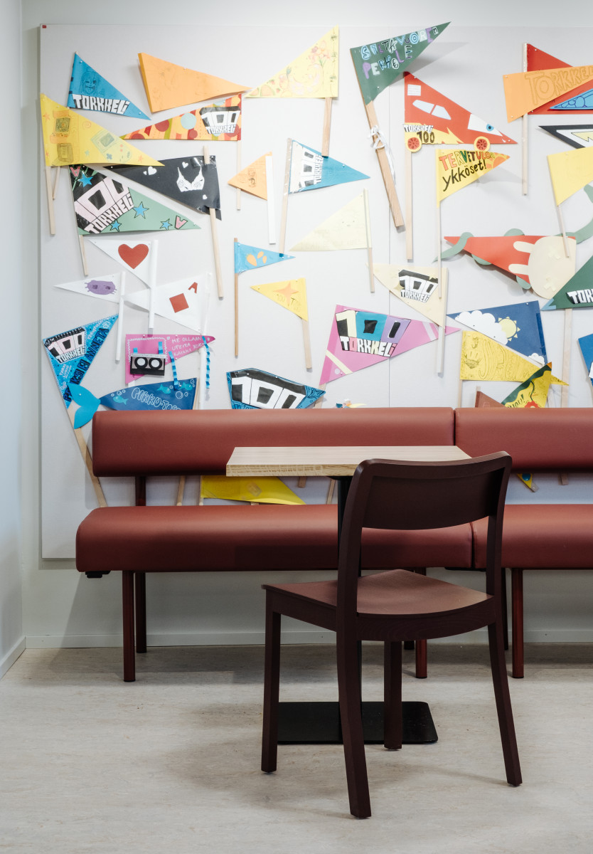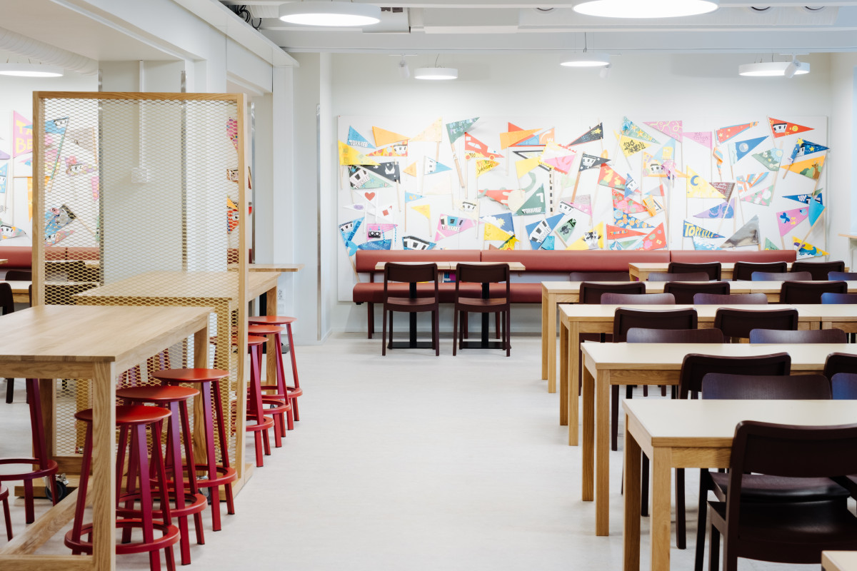 Ruokalassa kalustus tukee tilan monikäyttöisyyttä ja toimii osana koulupäivän arkea. Lepo Martta -sohvat tarjoavat pehmeitä istuskelupaikkoja, ja Hay Pastis -tuolit tummanpunaisissa ja tummansinisissä sävyissä tuovat tilaan ilmettä. Hay Revolver -pyörivät jakkarat soveltuvat joustavaan ja vapaamuotoiseen käyttöön.