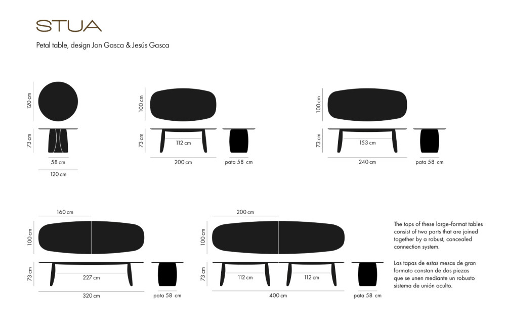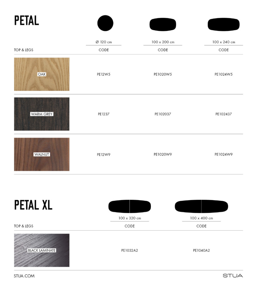 Stuan Petal pöydät ovat veistoksellisia ja kauniisti kaartuvia. Pöydän jalka on kaartuvan terälehden muotoinen ja siitä pöytä on saanut myös nimensä. Samaa kaarimuotoa jatkaa myös pöytälevy ja näin kokonaisuus on taipuisa ja persoonallinen.
