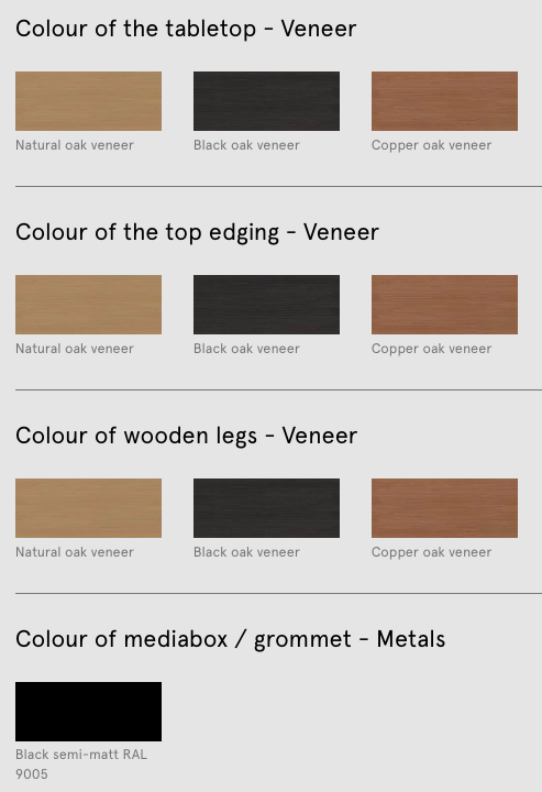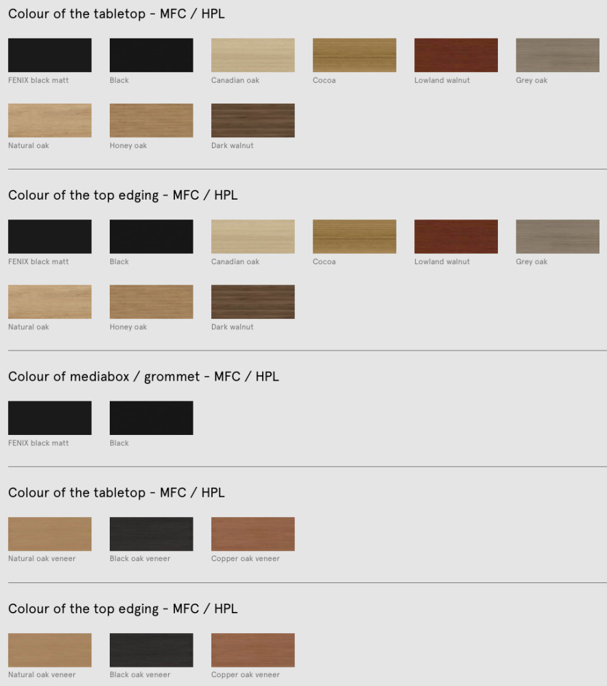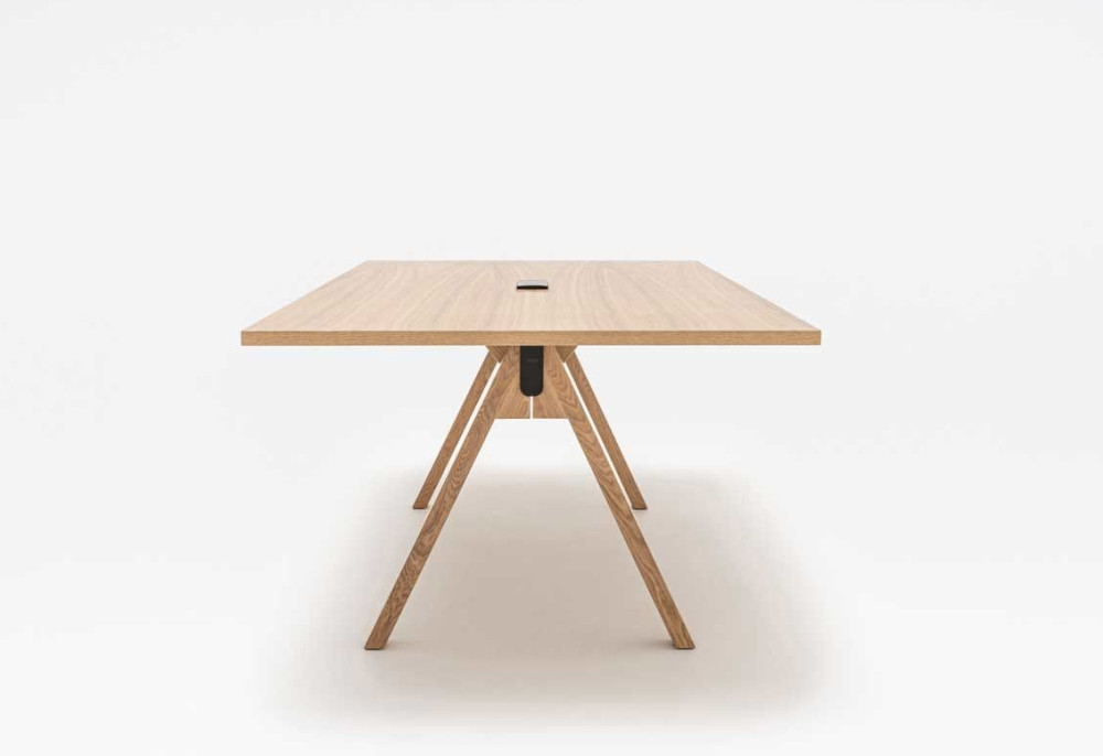 Pöydän selkeälinjainen suorakaiteen muotoinen kansi lepää tukevilla massiivipuisilla jaloilla, jotka tuovat ilmeeseen lämpöä ja luonnollisuutta. Viga on suunniteltu käytännölliseksi ja mukavaksi työskentely- ja neuvottelupinnaksi ilman turhia elementtejä. Saatavilla on myös lisävarusteita, kuten mediaboxit ja sormenjälkiä hylkivä Fenix-nanolaminaatti, jotka lisäävät käytettävyyttä ja ergonomiaa.