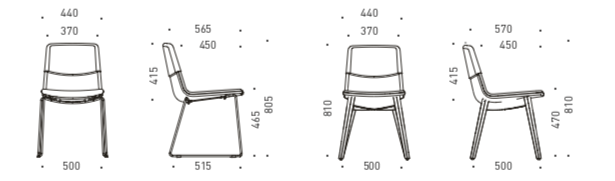 - Lenkkijalka: musta, valkoinen, hopeanharmaa, pronssi ja tummanharmaa. (Lenkkijaloilla tuoli on pinottava.)