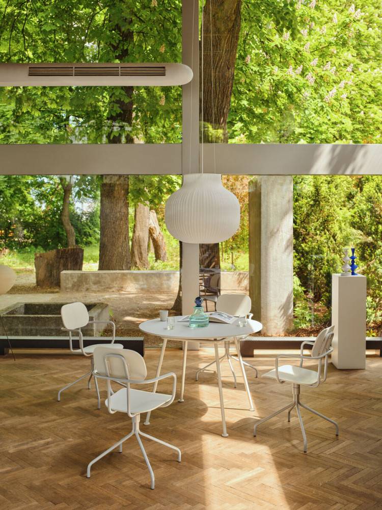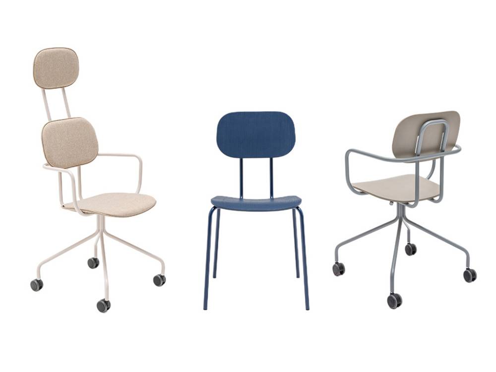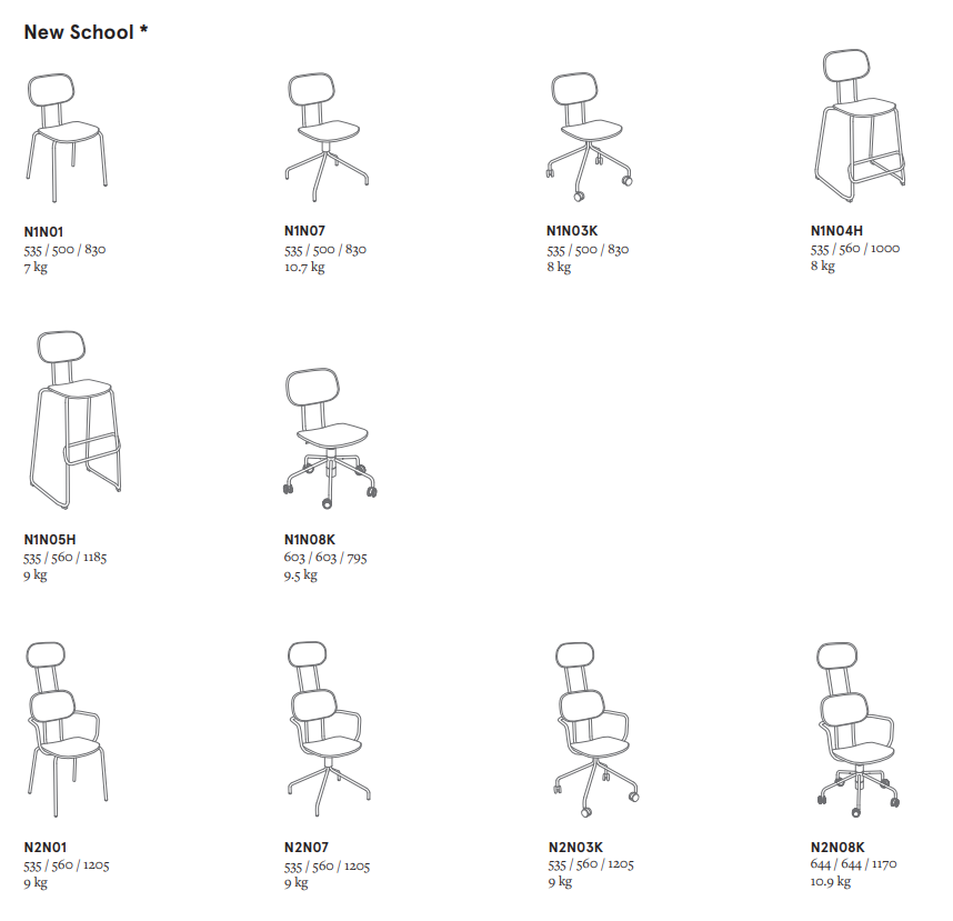 New School on osa laajaa tuoteperhettä, johon kuuluu tuolien lisäksi myös lounge-istuimia, jalkarahit, baarituoleja ja pöytiä. Malliston avulla voidaan kalustaa koko tila yhtenäisellä ja modernilla ilmeellä.