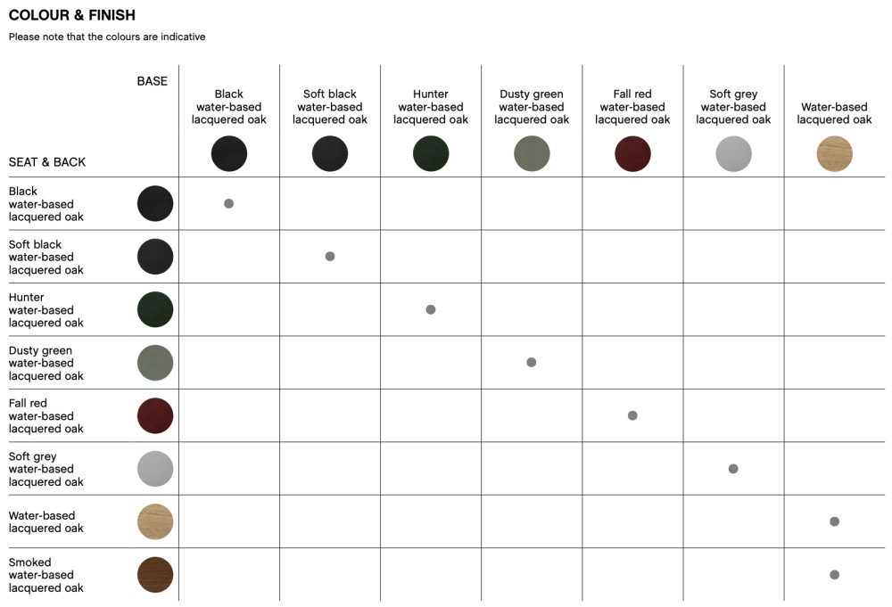 Saatavana useissa puuviimeistelyissä ja väreissä. Saatavana myös istuinverhoilulla eri kangas- ja nahkavaihtoehdoilla. Lisävarusteina saatavana mm. huopaliukunastat, kuljetusvaunu sekä rivikytkentä.