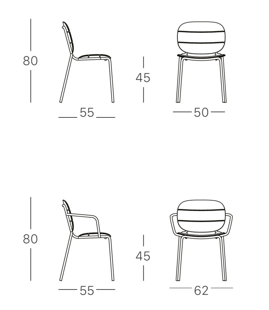 SCAB SI-SI tuolisarjassa on samaan runkoon saatavana neljä erilaista istuinta. 3 metallista ja 1 puinen istuin. Tuolit soveltuvat sekä sisä- että ulkokäyttöön. Kaikkia malleja saatavana käsinojattomana ja käsinojilla.