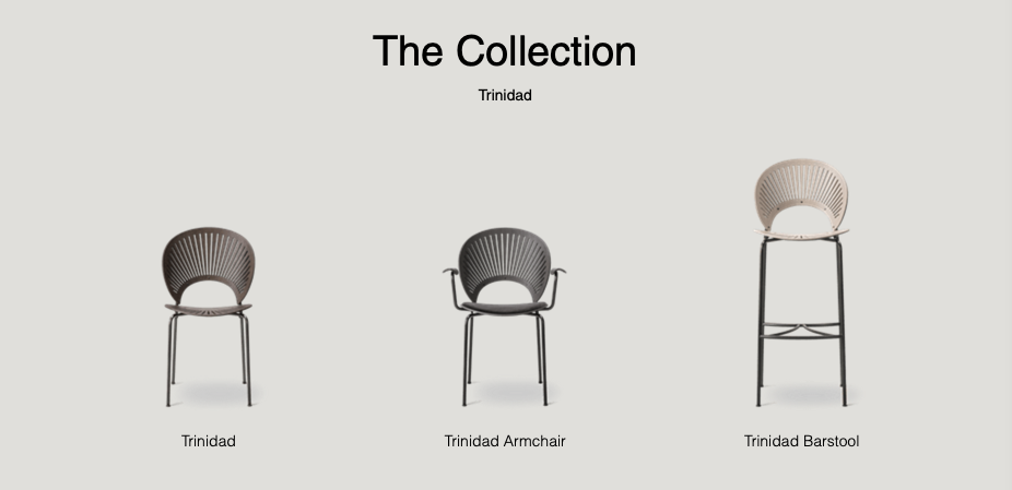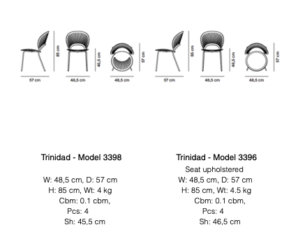 Trinidad sarjaan kuuluu myös käsinojallinen vaihtoehto 3399 tai 3397 (istuinosa verhoiltu) ja baarituoli 3400 tai 3401 (istuinosa verhoiltu)