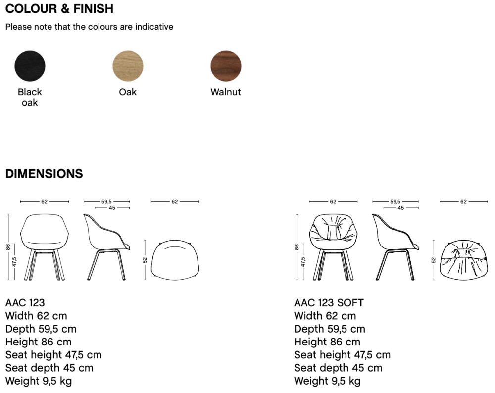 HAY AAC 123 ja AAC 123 Soft ovat osa laajaa About A Chair -sarjaa, joka sisältää tuoleja, työtuoleja, baarituoleja ja lounge-kalusteita. Mallille on ominaista korkea selkänoja, yhtenäinen istuinmuoto ja puujalusta, jotka muodostavat ajattoman kokonaisuuden. Tuolit soveltuvat ruokailutiloihin, neuvottelutiloihin, aulatiloihin ja muihin julkisiin sekä puolijulkisiin ympäristöihin. Verhoiltu istuin ja ergonominen muoto tukevat pitkäkestoista istumista, mikä tekee mallista toimivan myös projektikohteissa.