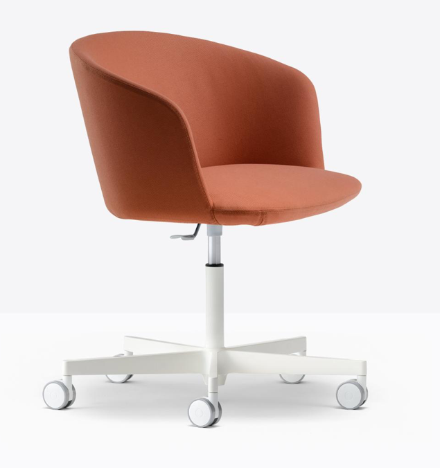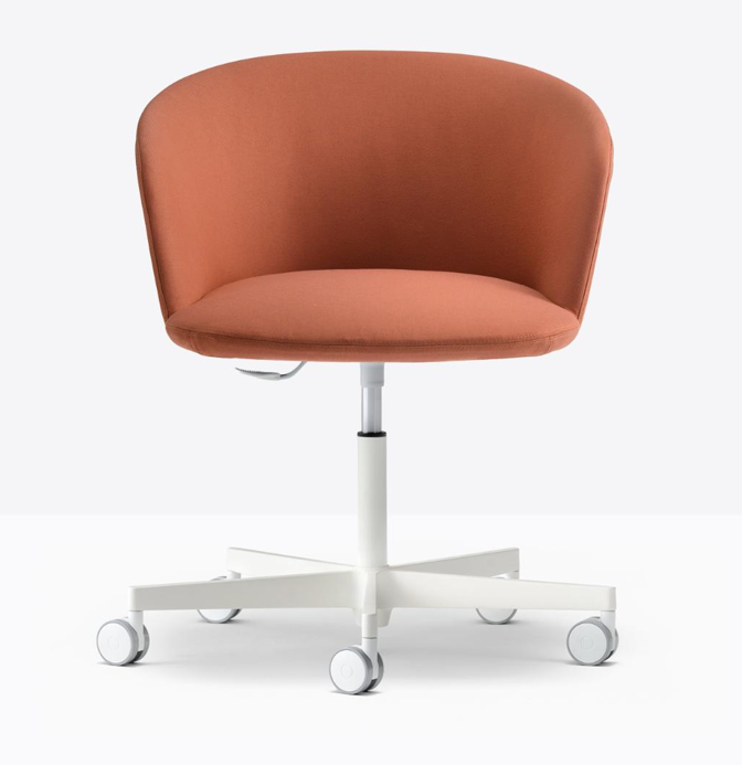 Pedrali Nym Soft 2877 tuolissa on pyörivä ympäriverhoiltu istuinosa. Korkeussäädettävä teräsrunko ja valettu alumiininen 5 sakarainen ristikkojalka pyörillä.