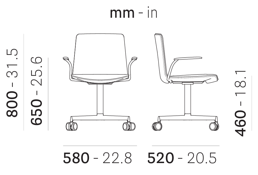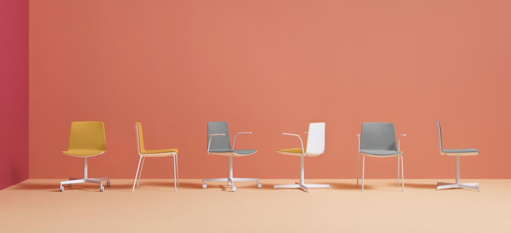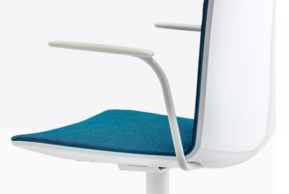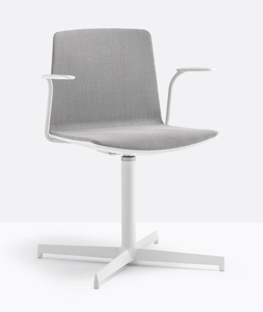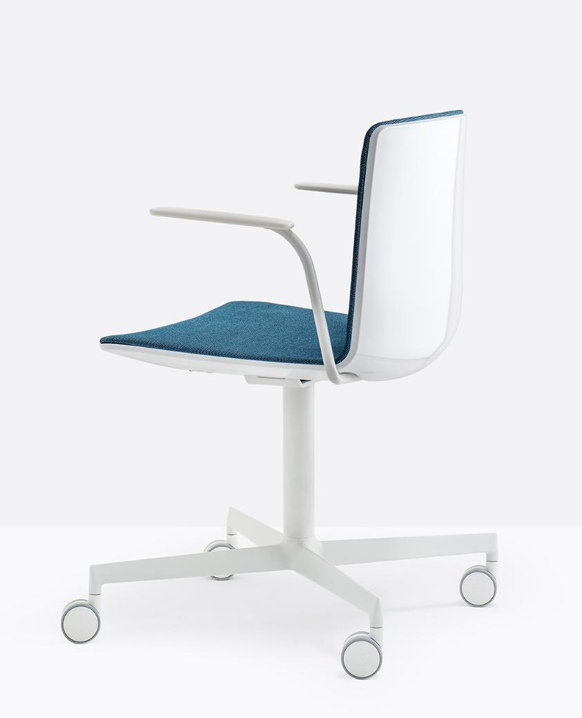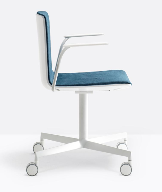 PEDRALI Noa 728 tuolissa on kääntyvä polykarbonaatti istuinosa etuverhoilulla. Valettu alumiininen 4 sakarainen ristikkojalka pyörillä.