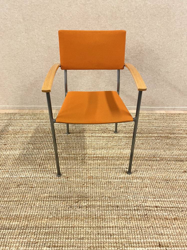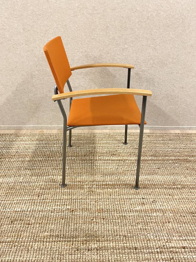 Isku logo tuoli.Verhoiltu oranssilla kankaalla, käsinojan päälliset tammea.