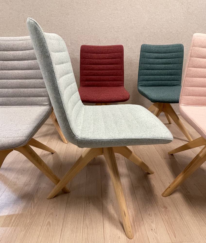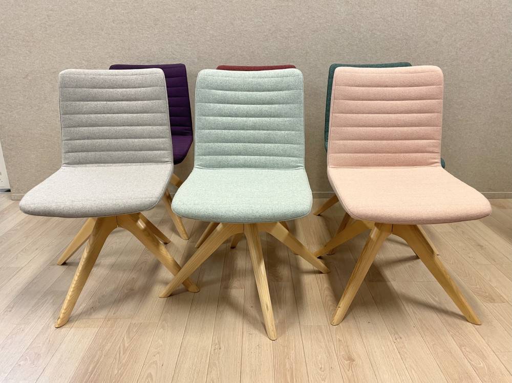 Siistikuntoisia laadukkaita neuvottelutuoleja.Kääntyvä jalusta, villakangasverhoilu.Sopii hyvin myös ravintolakäyttöön, tuoleja on käytössä mm. Tallink laivoilla.