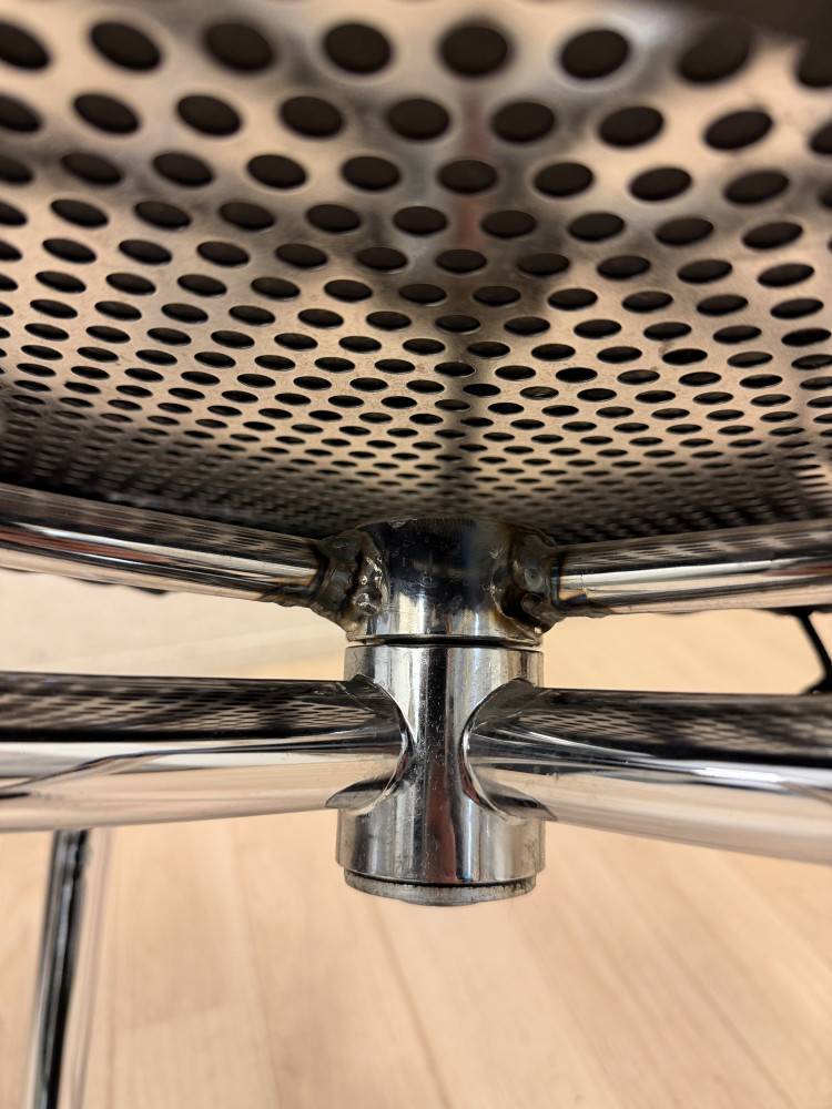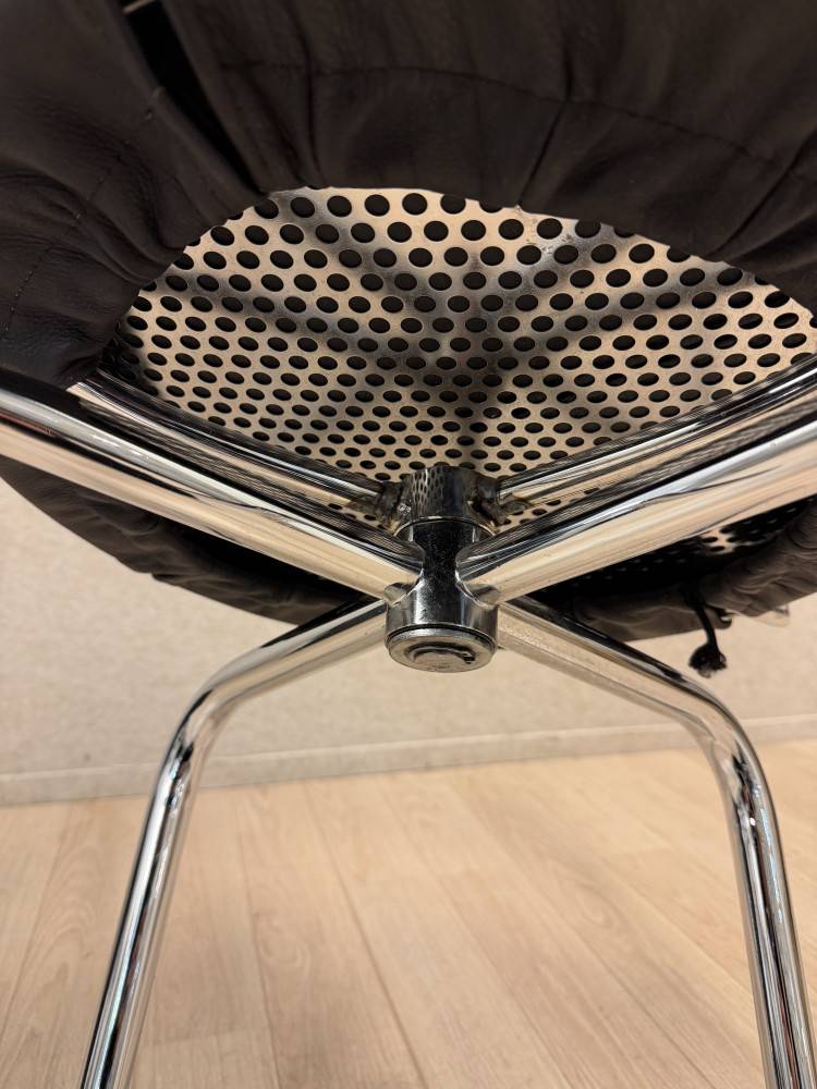 Kunto: Jalusta korjattu hitsaamalla (ks. kuvat). Nahka säilynyt hyvässä kunnossa. Käsinojissa vähäisiä käytön jälkiä. Luonnollinen patina korostaa tuolin ikää ja luonnetta.