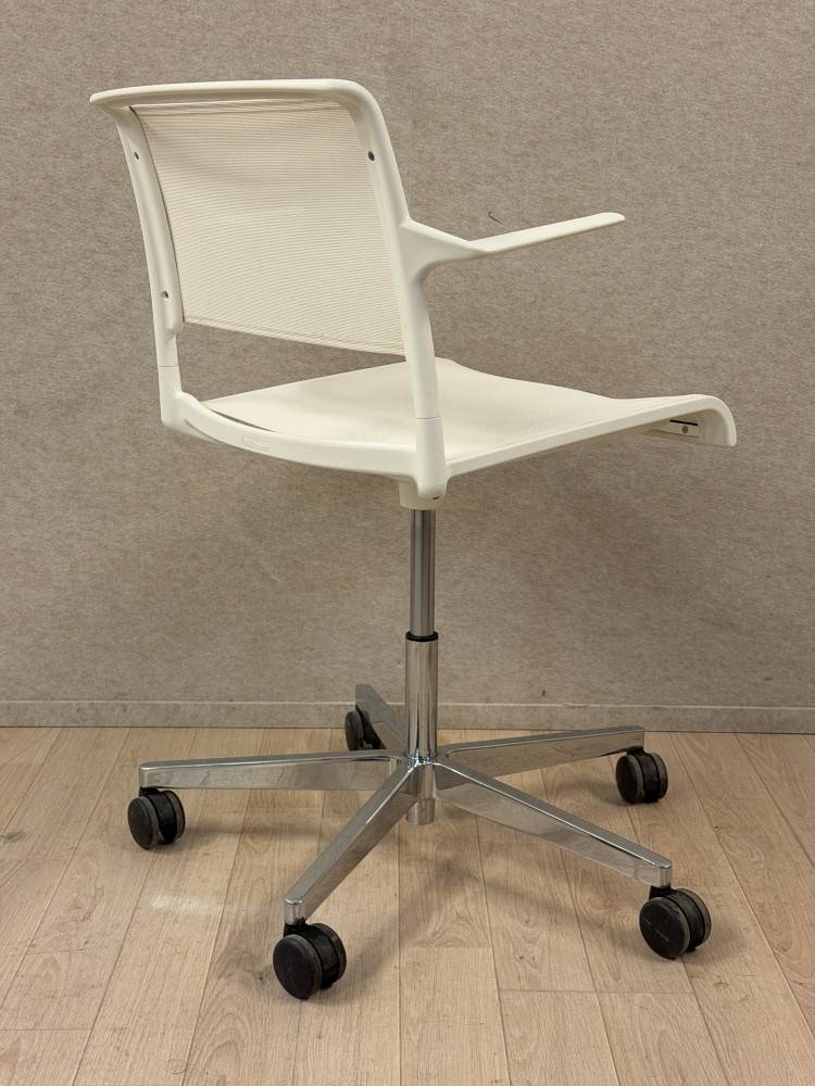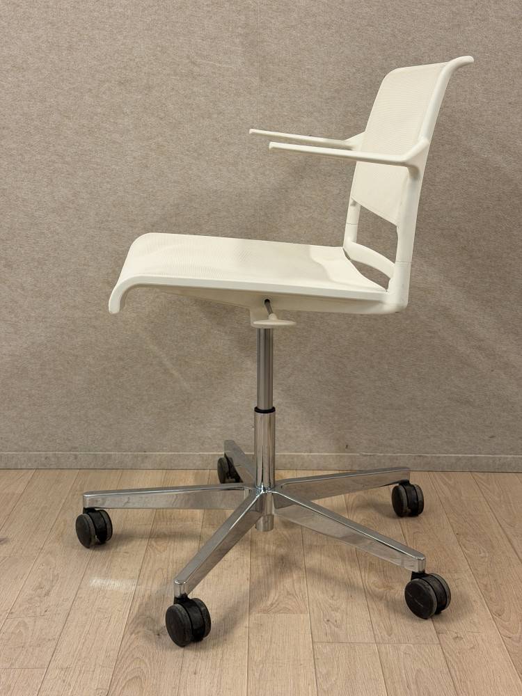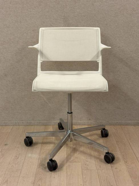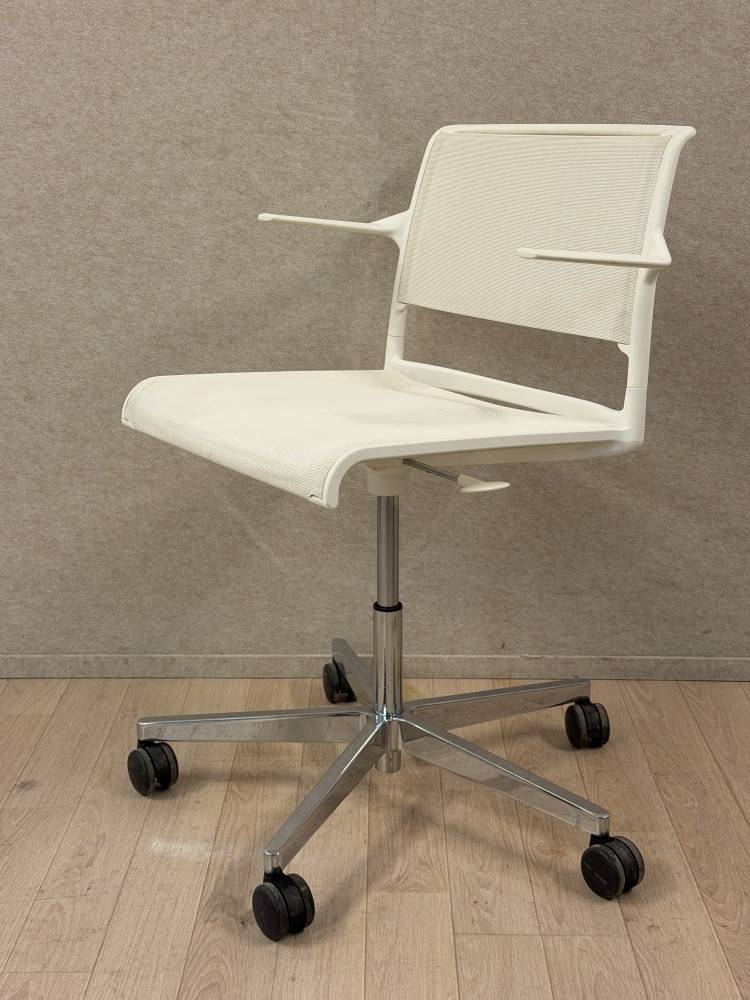 Wilkhahn Aline on saksalainen design-neuvottelutuoli moderneihin toimisto- ja asiantuntijaympäristöihin. Tämä käytetty Wilkhahn Aline -tuoli on verkkorakenteinen kokonaisuudessaan, eli sekä istuin että selkäosa ovat verkkomateriaalia. Tuoli on varustettu käsinojilla sekä viisisakaraisella kiillotetulla alumiinijalustalla pyörillä.