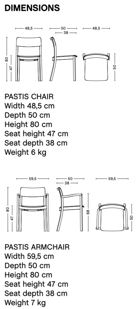 HAY Pastis on massiivipuinen kalustesarja, joka yhdistää selkeän rakenteen ja ajattoman muotokielen. Sarjaan kuuluu tuoleja, käsinojatuoleja sekä pöytiä, mikä mahdollistaa yhtenäisten kalustekokonaisuuksien suunnittelun erilaisiin julkisiin ja yksityisiin tiloihin. Tuolit soveltuvat ruokailutiloihin, kahviloihin, neuvottelutiloihin ja muihin julkisiin ympäristöihin. Kestävä rakenne ja pinottavuus tukevat käyttöä projektikohteissa ja tiloissa, joissa kalusteiden muunneltavuus on tärkeää.