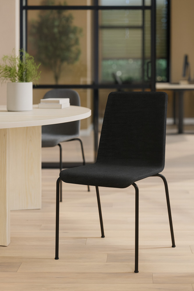 Tässä mallissa istuin on ympäriverhoiltu Berta-polyesterikankaalla, sävy GA00 Graphite, ja se on yhdistetty mustaan metalliseen nelipistejalustaan. Tuolit ovat pinottavia, mikä säästää tilaa ja helpottaa varastointia sekä siirtelyä.