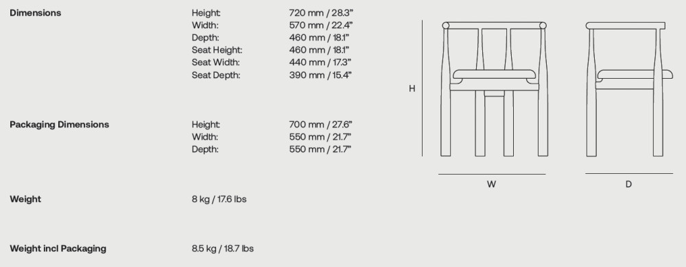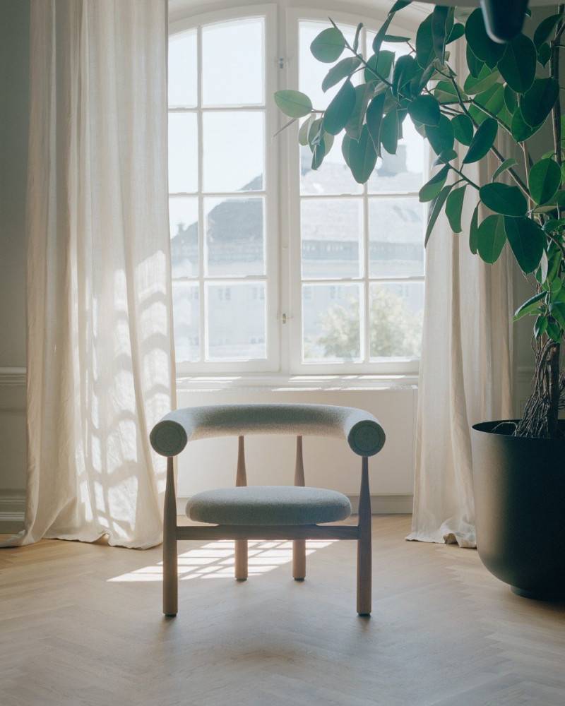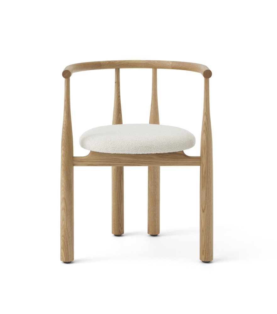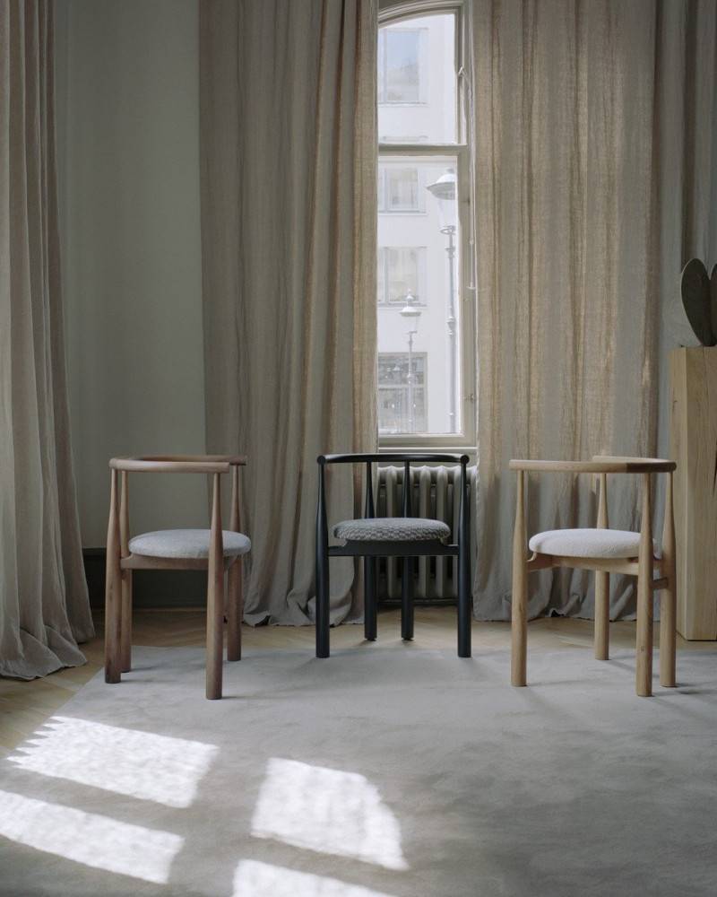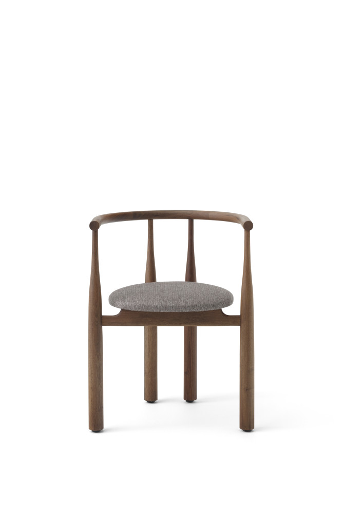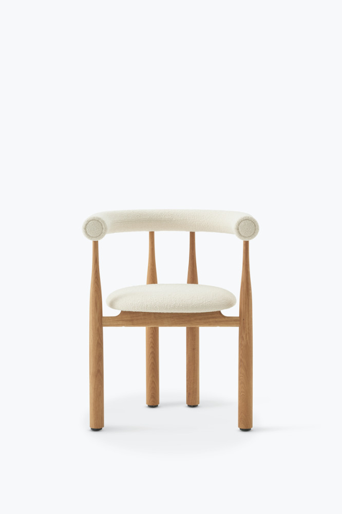 Tuolin painopiste on suunniteltu alaspäin, mikä antaa sille vahvan ja monumentaalisen olemuksen. Keskellä rakennetta sijaitsee verhoiltu istuin, joka tuo pehmeyttä ja mahdollistaa erilaisia ilmeitä puun ja tekstiilin yhdistelmillä.