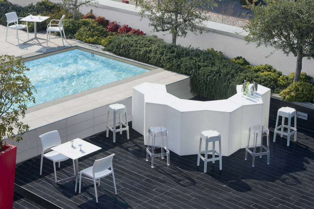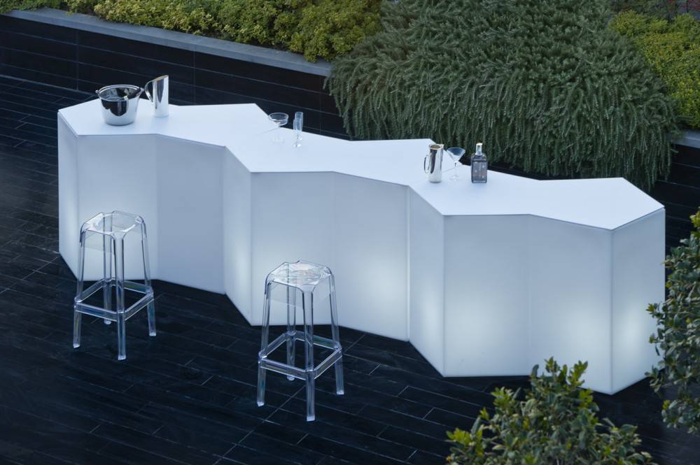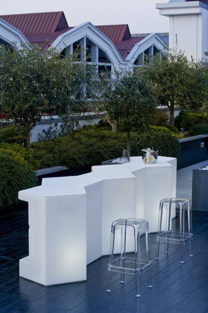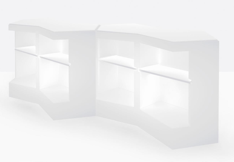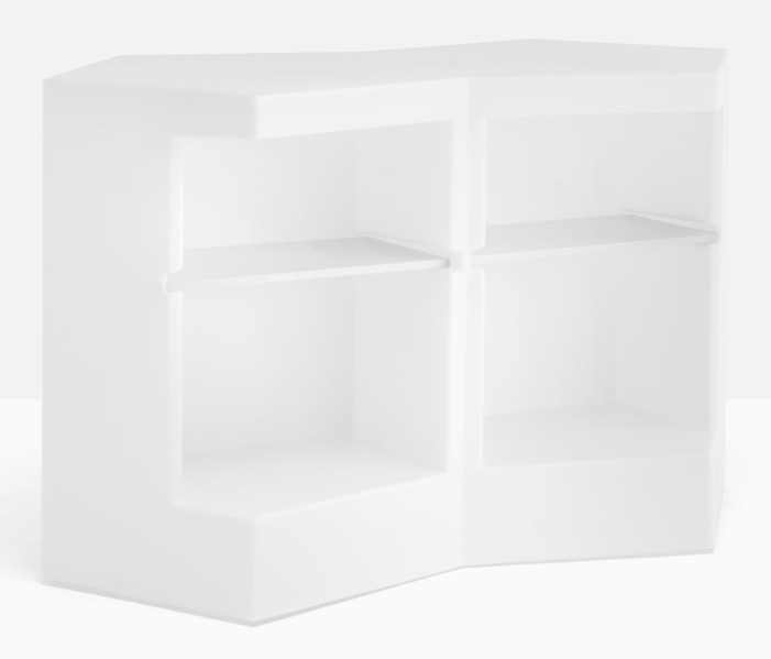 Modulaarinen baaritiski, josta voit koota haluamasi kokonaisuuden. PEDRALI ICEBERG baaritiskiä voi käyttää sekä ulkona että sisällä. Jos haluat vain pienen tiskin, yksi moduuli riittää. Halutessassi ison tiskin, yhdistele moduuleja vapaasti. Tiskissä on mustat säätötassut alla, jotta saat moduulit täsmälleen samaan tasoon. Tiskin etupuoli on alapäin vino, jotta asiakkaan on helpompi lähestyä tiskiä. Tiski on saatavissa myös upeasti valaistuna. Lisäksi tiskiin on valittavissa hyllylevyt sekä erillinen kestävä akryylilevy tiskin päälle.