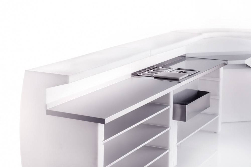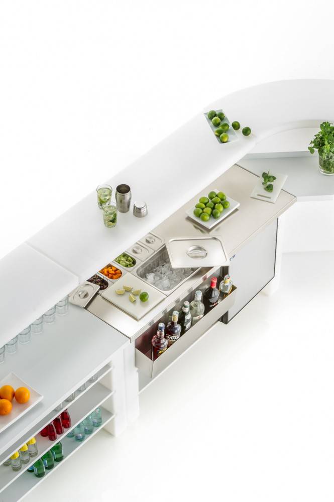 PEDRALI IGLOO baaritiskissä on metallinen työskentelytaso, kun muuten tiski on naarmuuntumista kestävää polyeteeni materiaalia.