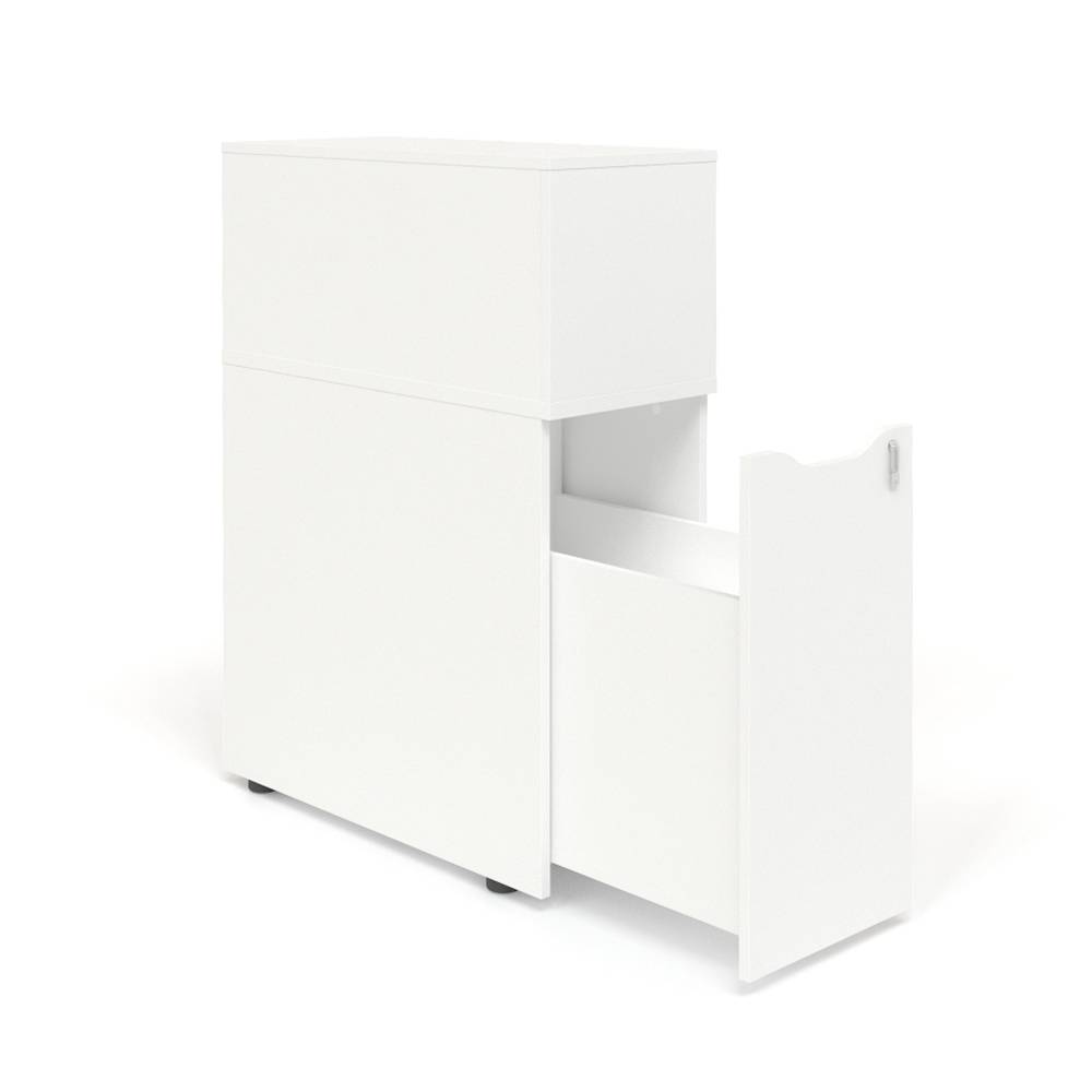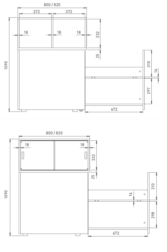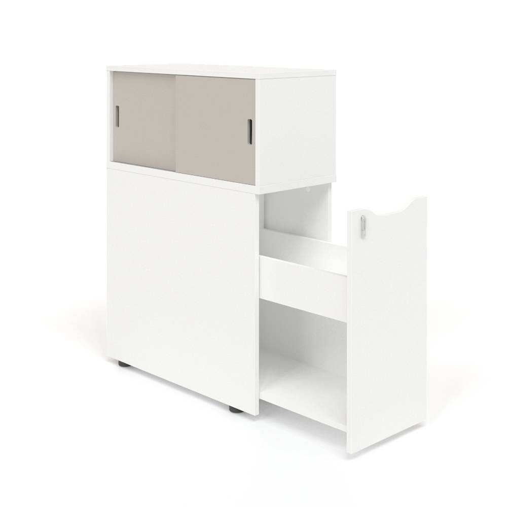 Kaapissa on yksi hylly mapeille ja yksi laatikko sekä avohylly päällä, jonka voi valita liukuovilla tai ilman. Alaosa on lukittava ja mukana tulee 2 avainta. Kaapin kuormitus max 50 kg.