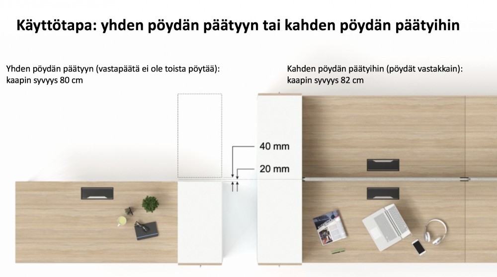 Yhden pöydän päätyyn (vastapäätä ei toista pöytää): syvyys 80 cm