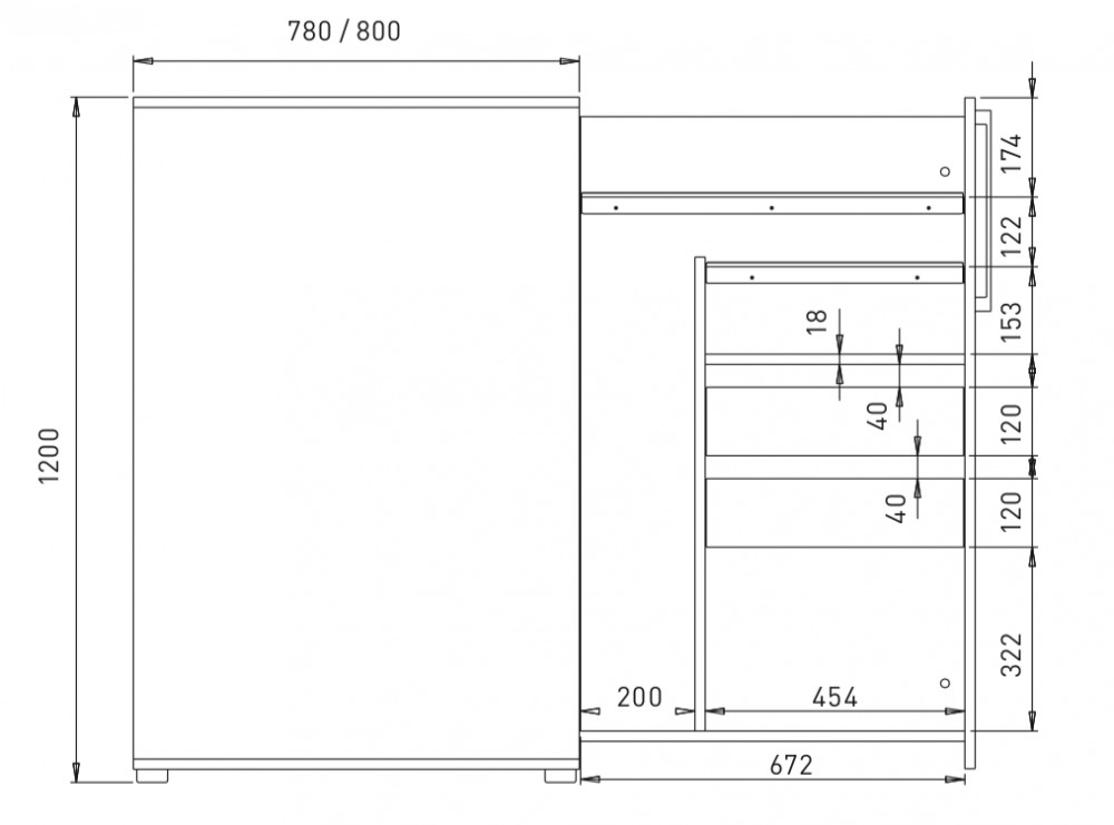 syvyys 80 cm tai 82 cm, korkeus 120 cm, leveys 42 cm