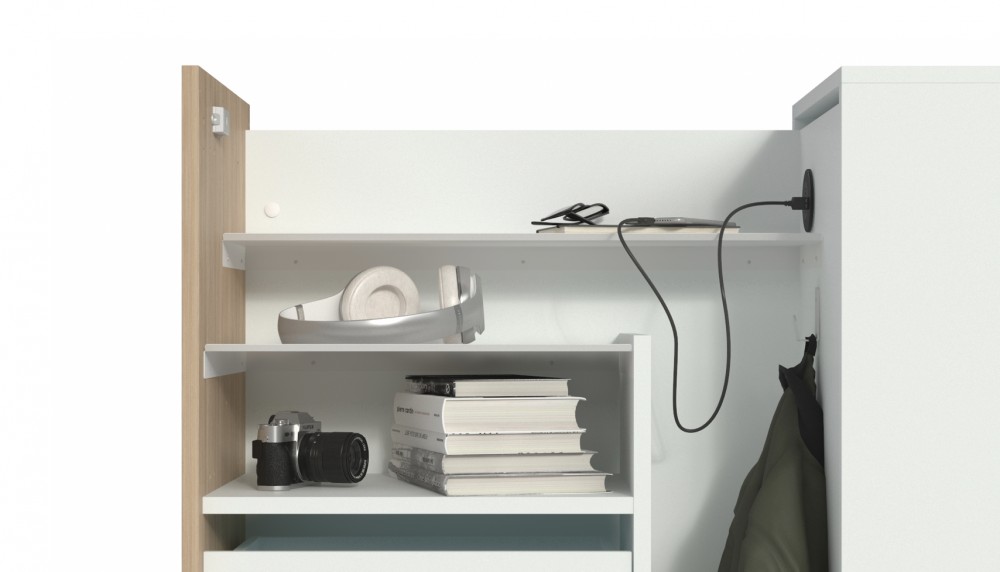 Kaapissa on yksi hylly ja kaksi pientä laatikkoa sekä pistoke. Pistokkeeseen saa joko virtapistokkeen tai usb-portin. Kaappi on lukittava ja mukana tulee 2 avainta. Kaapin kuormitus on max 50 kg.