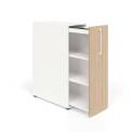 Siistejä EFG:n apteekkarinkaappeja valkoisella rungolla ja tammilaminaatti ovella.