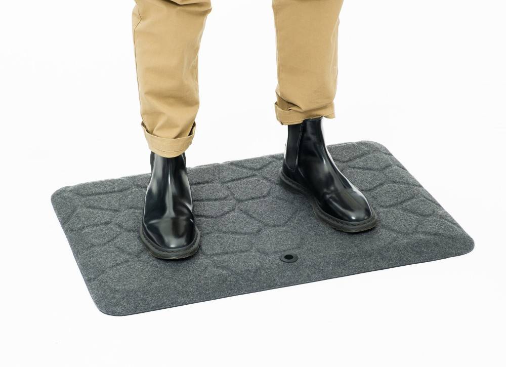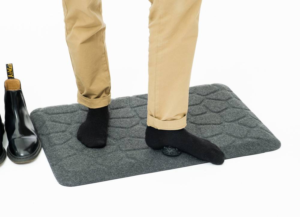 Mattoa on erittäin mukava käyttää sukkasiltaan. Optiona myytävä hierontapallo täydentää paketin. Hierontapallolla saat kiihdytettyä jalkapohjan verenkiertoa ja ekstramukavuutta seisomatyöhön. Matto on kätevä ripustaa pöydän reunaan roikkumaan mukana tulevan koukun avulla.