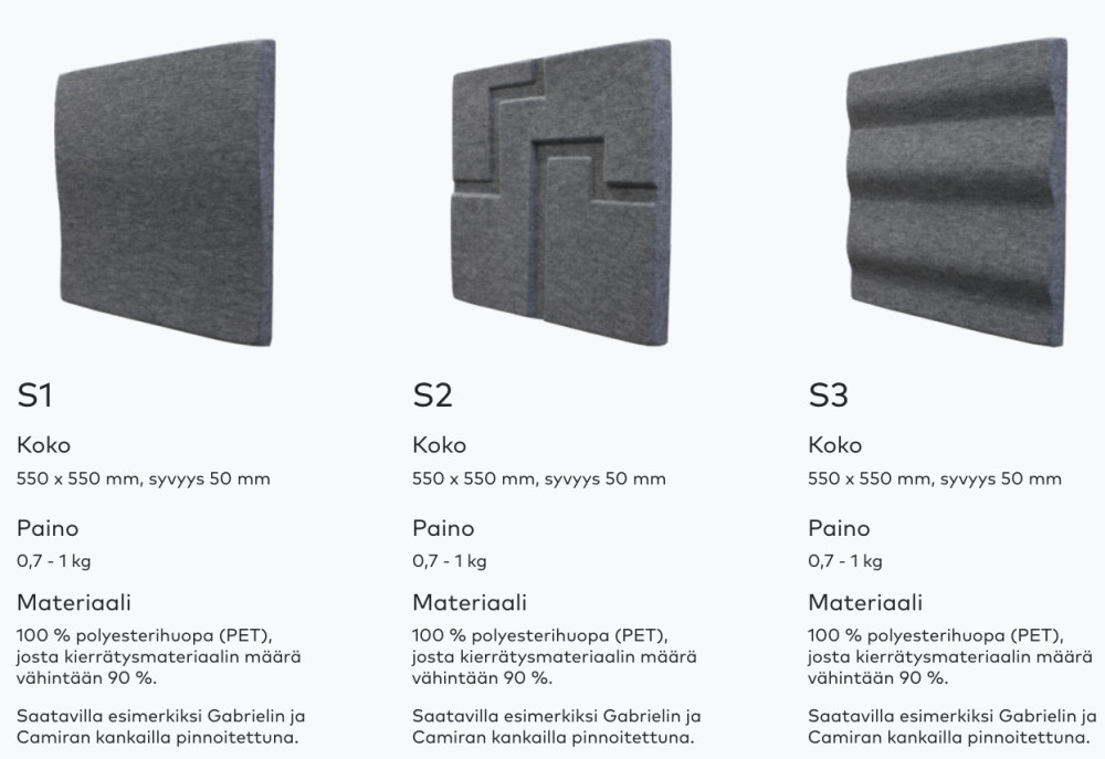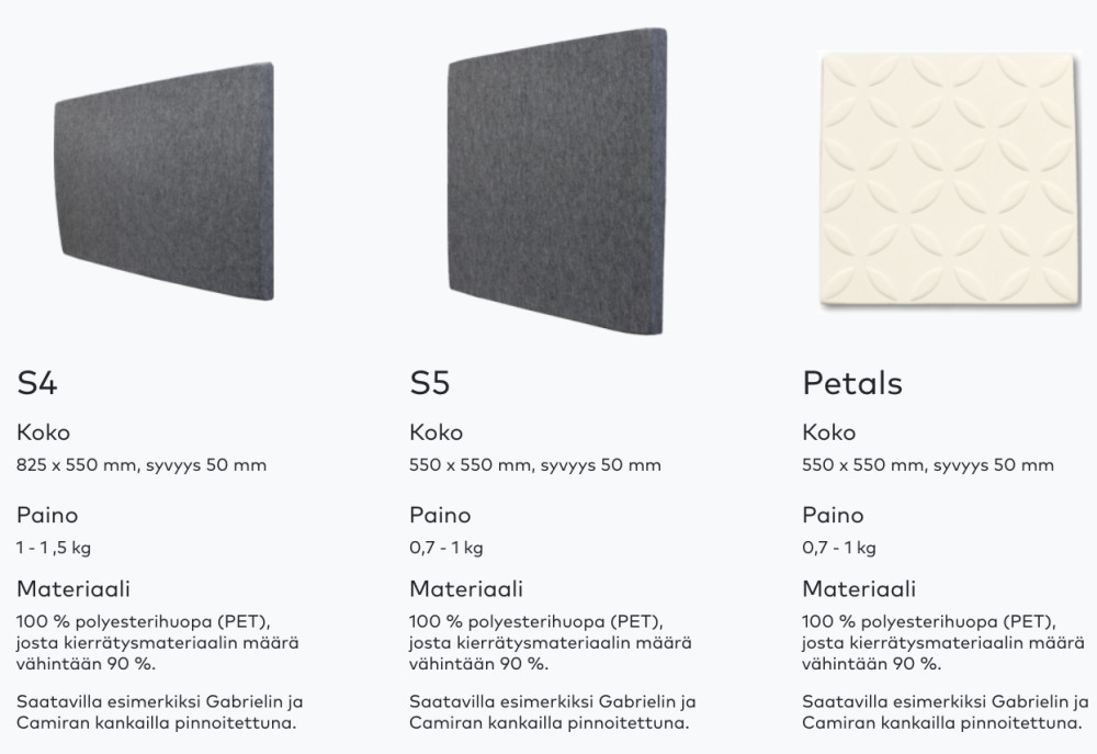 Paneelit valmistetaan 100 % polyesterihuovasta, joka on valmistettu ilman liuottimia tai haitallisia kemikaaleja. Akustiikkatäyte koostuu joko kierrätetyistä tai uusista polyesterikuiduista. Materiaali on kierrätettävää, turvallista ja rakenteeltaan kestävää julkitilakäyttöön. Tuotteet valmistetaan Suomessa.