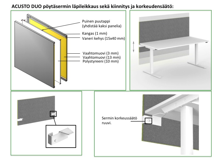 Sermi kiinnitetään pöytään metallisilla kiinnikkeillä. Sermin kokonaiskorkeus 74 cm. Sermin korkeus pöytään nähden on vapaasti säädettävissä.