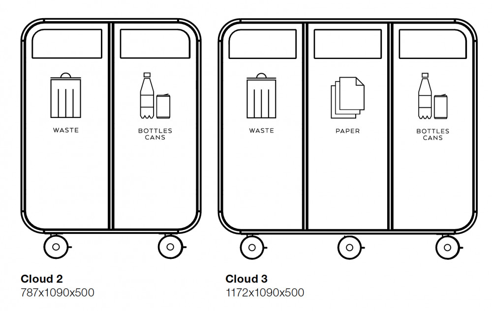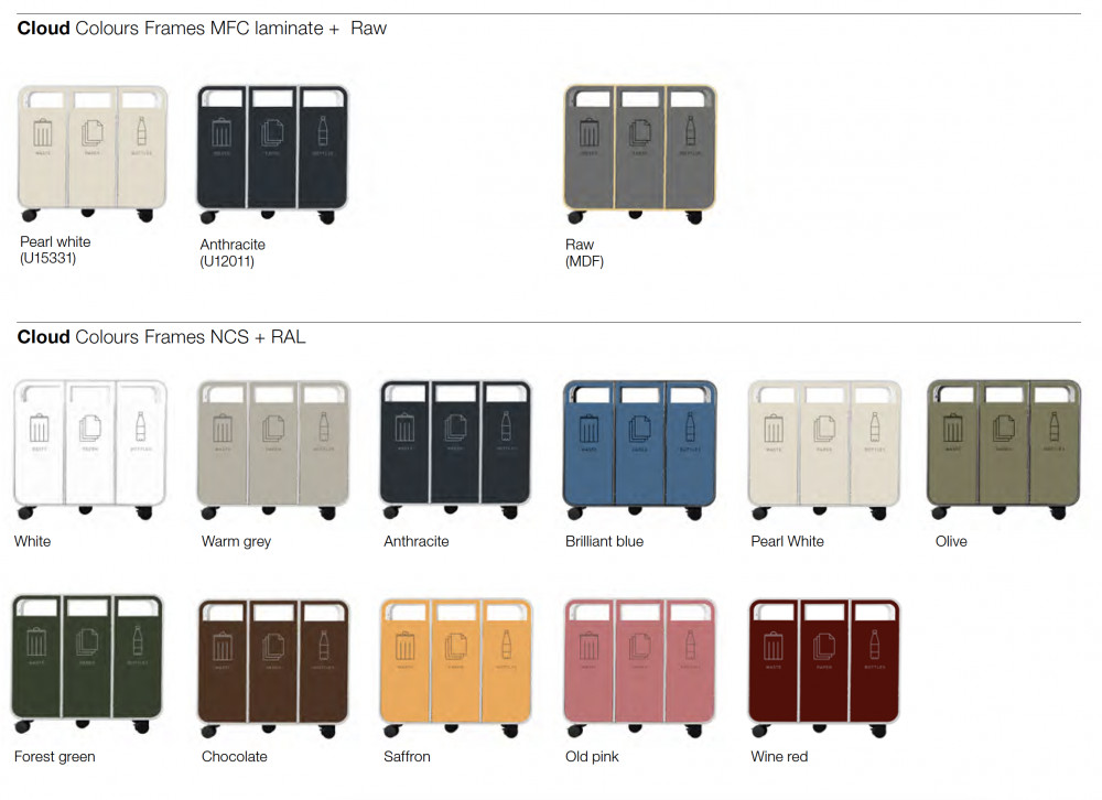 Käytettävä molemmin puolin, joten Cloudin voi sijoittaa seinää vasten tai keskelle huonetta. Ovien sisäpuolella luiska, joka ohjaa jätteet pussiin. Symbolit ovissa ja takana: symbolit voi itse valita vaihtoehdoista. Edessä ovet ja kiinteä takaosa. Rungon materiaali umpilaminaatti (väri helmevalkoinen tai antrasiitinharmaa) tai lakattu MDF (eri värivaihtoehtoja). Ovet pulverimaalattua terästä, oville useampia eri värivaihtoehtoja.