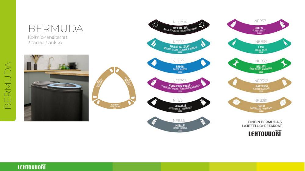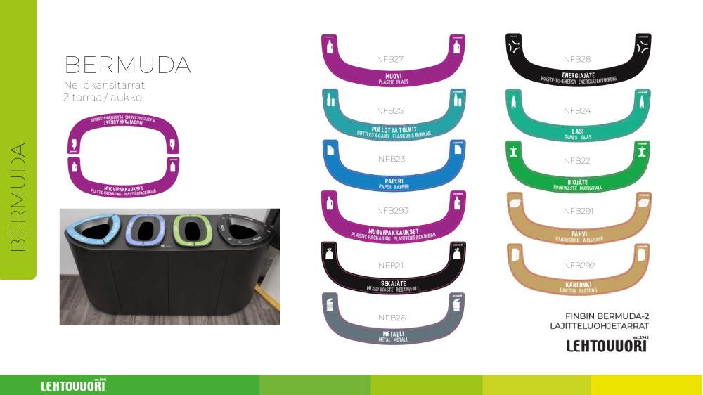 Lehtovuori Bermuda on roska- ja lajitteluastiasarja, joka on suunniteltu julkitiloihin ja vaativaan ammattikäyttöön. Sarja kattaa useita koko- ja kokoonpanovaihtoehtoja yksittäisistä roska-astioista monilokeroisiin lajitteluratkaisuihin. Tuotteet soveltuvat erityisesti toimistoihin, oppilaitoksiin, aulatiloihin sekä muihin julkisiin ja puolijulkisiin ympäristöihin, joissa edellytetään selkeää ja kestävää jätehuoltoratkaisua.