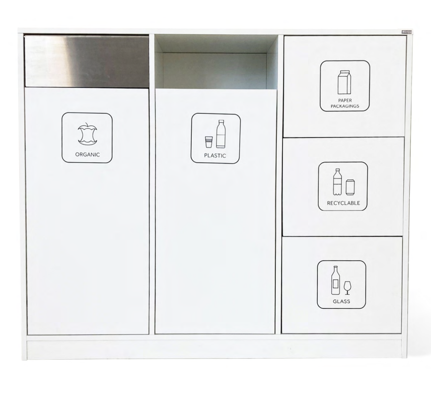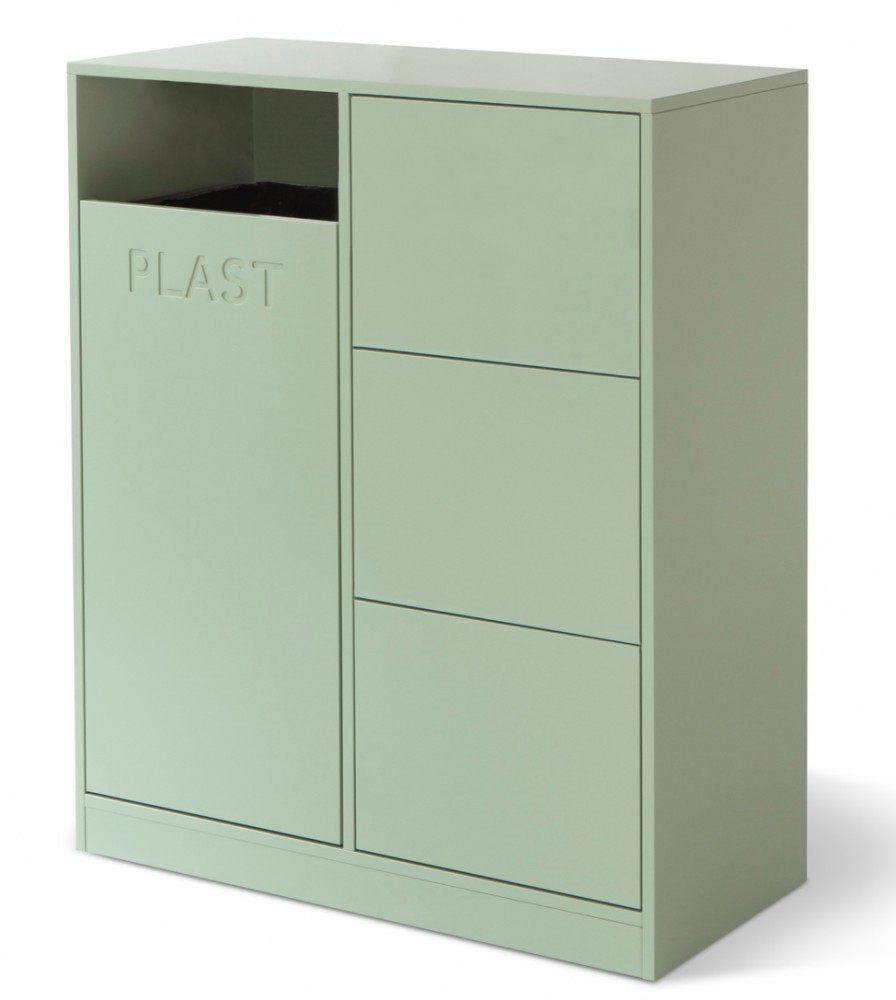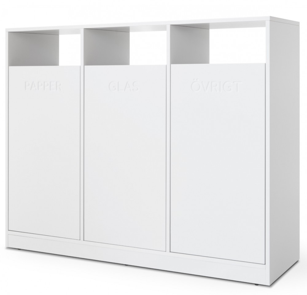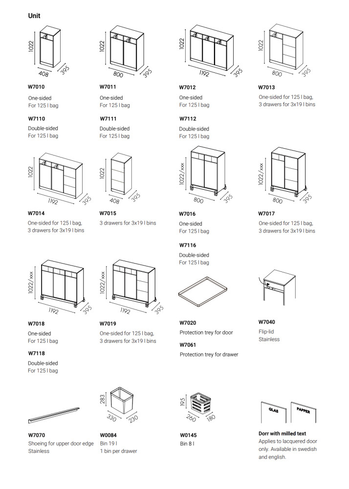 Yksiköiden sisällä jätesäkkipidike. Jätesäkki 125 litraa, laatikoiden jäteastia 19 litraa. Huom. Jätesäkit ja jäteastiat eivät sisälly hintaan.