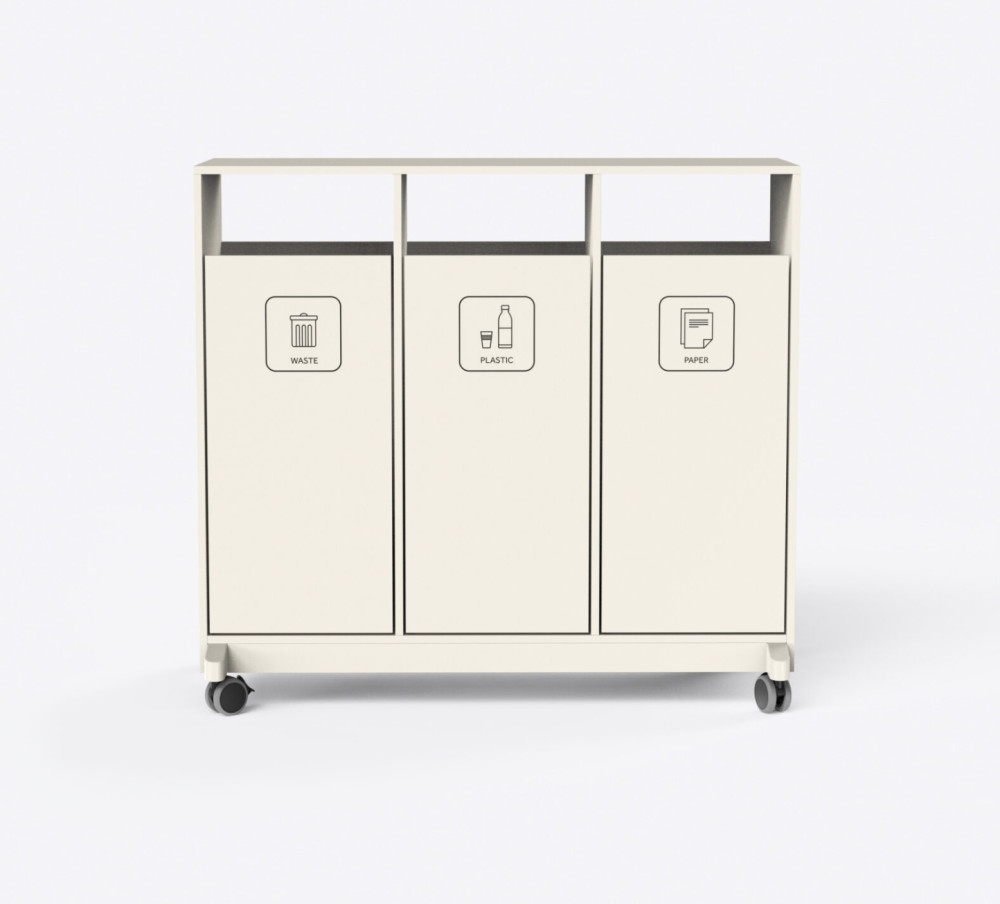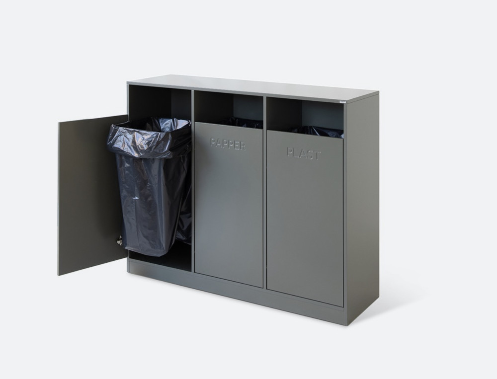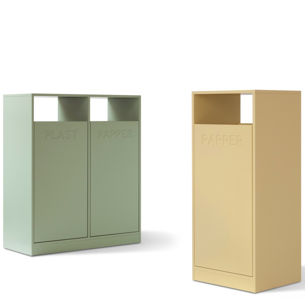LUNDQVIST WASTE UNIT kierrätysasema voidaan sijoittaa vapaasti huoneeseen joko seinän viereen tai keskella tilaa, koska malleissa valittavissa joko yksi- tai kaksipuolisena. Myös tekstin saa oveen tai sekä oveen että taakse.