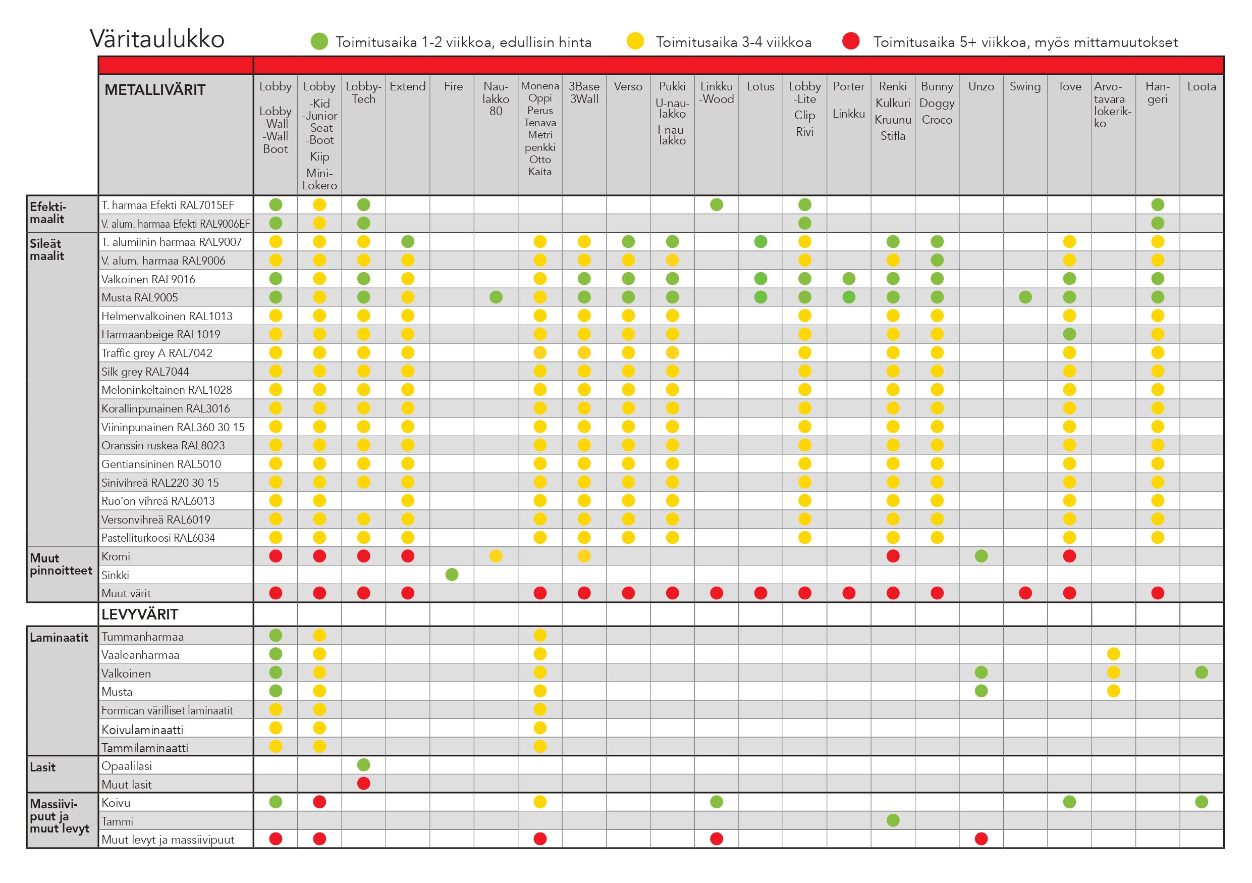 Kaita on saatavilla kahdessa koossa ja se on valmistettu maalatusta teräksestä. Lisävarusteina on saatavilla lajittelutarrat, kytkentäarja useamman kalusteen yhdistämiseen sekä pyörät kalusteen liikuteltavuuden parantamiseksi.