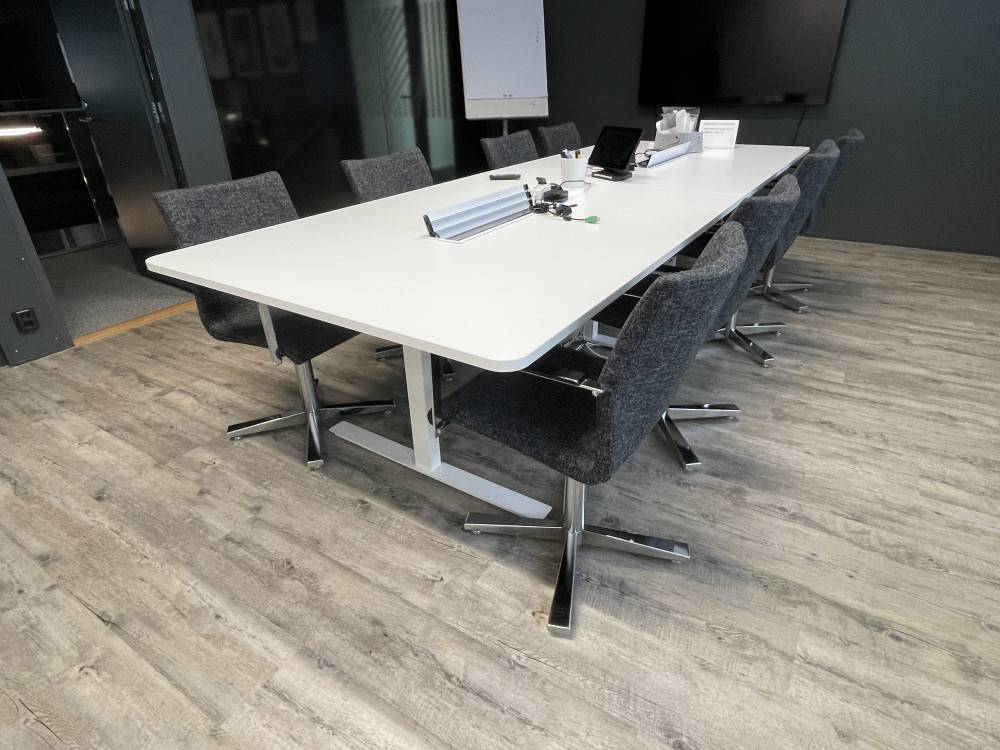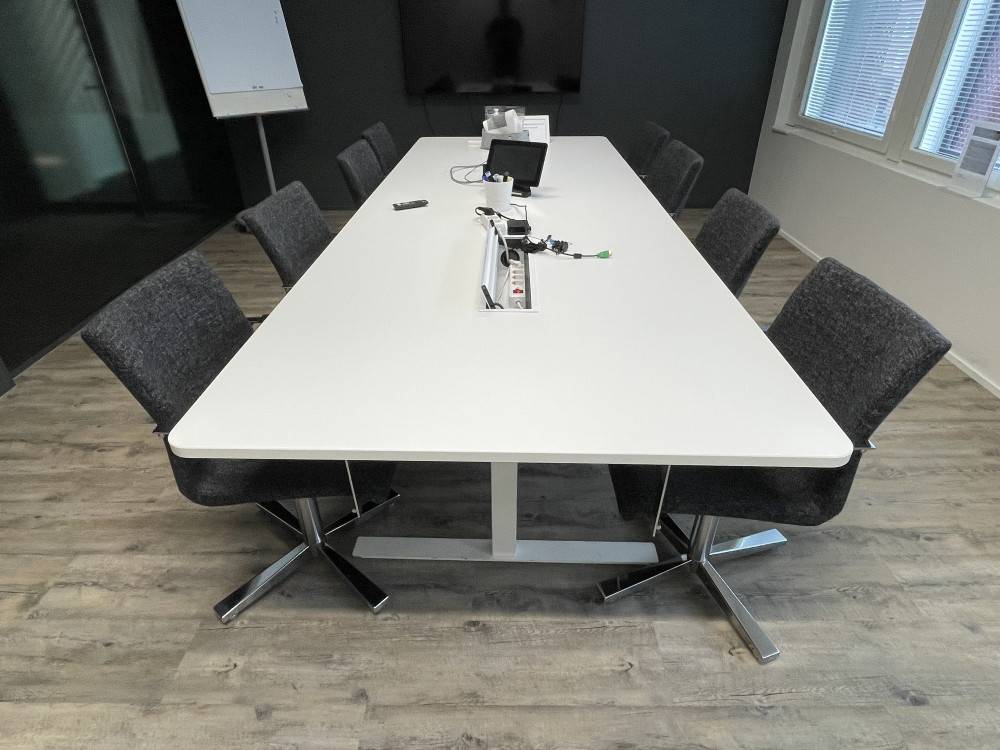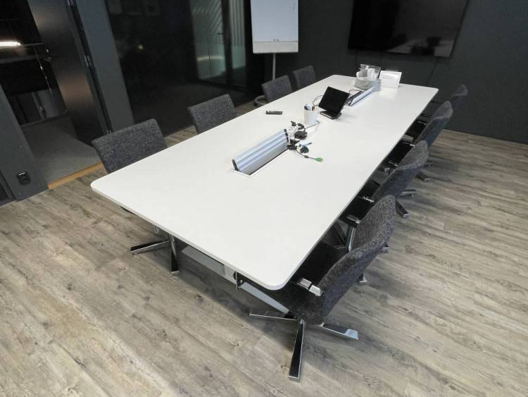 Mukana toimitetaan kahdeksan LEPO PRODUCT APOLLO -neuvottelutuolia, joissa on pyörivä jalusta ja palautusmekanismi. Tuolit yhdistävät istumismukavuuden ja käytännöllisyyden, ja palautusmekanismi varmistaa, että tila pysyy aina siistinä kokousten jälkeen.