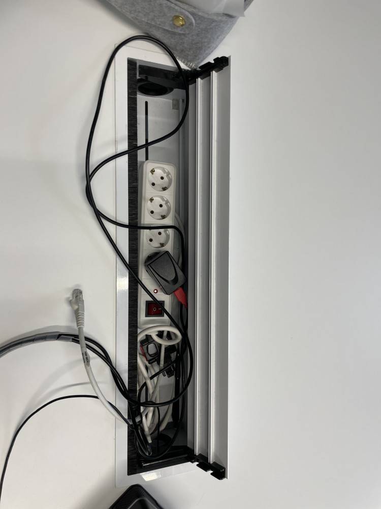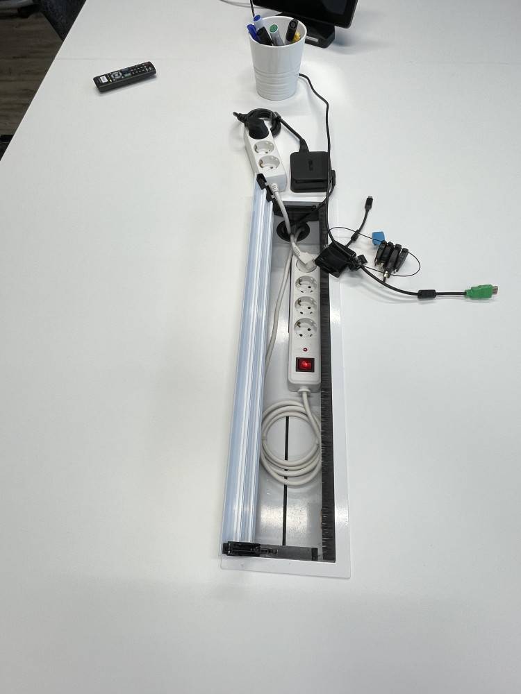 Pöydän keskellä on kaksi luukkua, joissa on pistokeyksiköt ja johtoläpiviennit. Tämä tekee kaapeloinnista huomaamatonta ja helpottaa sähkö- ja laitekäyttöä kokousten aikana.