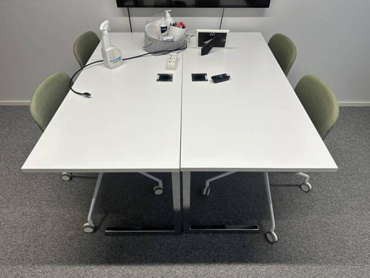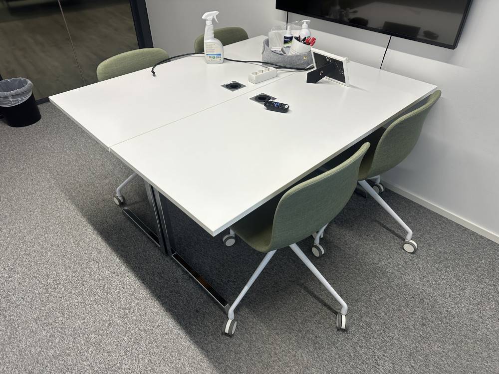 Kompakti ja tyylikäs neuvotteluryhmä, joka sopii pieneen kokoustilaan, työpisteiden yhteyteen tai projektikäyttöön. Pöytä koostuu kahdesta yhteen liitetystä osasta, ja sen kokonaismitat ovat 140 x 120 cm. Valkoinen kansi ja integroidut pistokeyksiköt tekevät kokonaisuudesta käytännöllisen ja modernin.