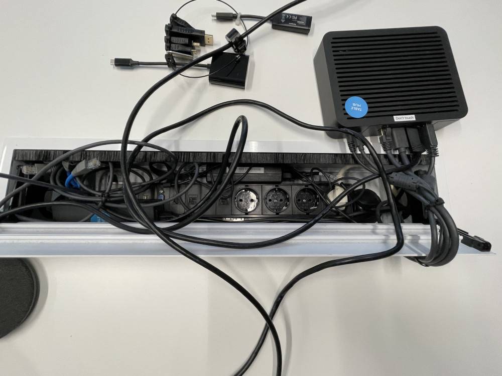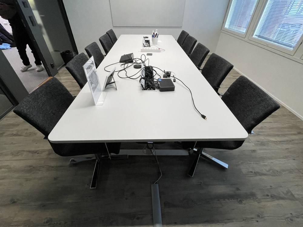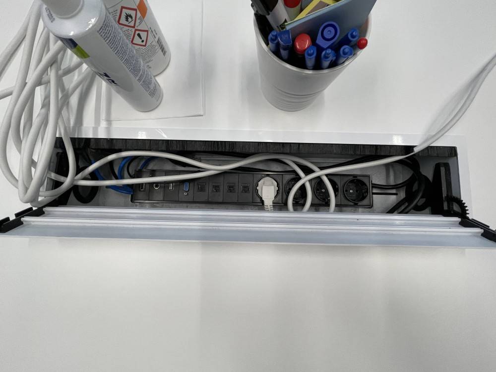 Pöytä: 320 x 120 cm, valkoinen kansi, kaksi johtoluukkua läpiviennillä ja pistokeyksiköillä