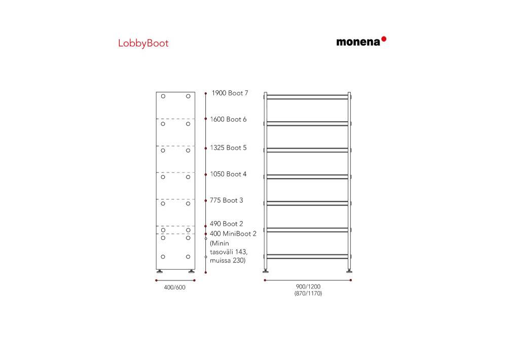 Monena LobbyBoot on muunneltava kenkäteline koulujen, päiväkotien ja muiden eteis- ja aulatilojen käyttöön. Se on osa Lobby-tuoteperhettä ja suunniteltu yhteensopivaksi sarjan muiden kalusteiden kanssa. Kenkäteline soveltuu sijoitettavaksi seinän viereen tai vapaasti tilaan yksittäisenä tai useamman kalusteen kokonaisuutena.