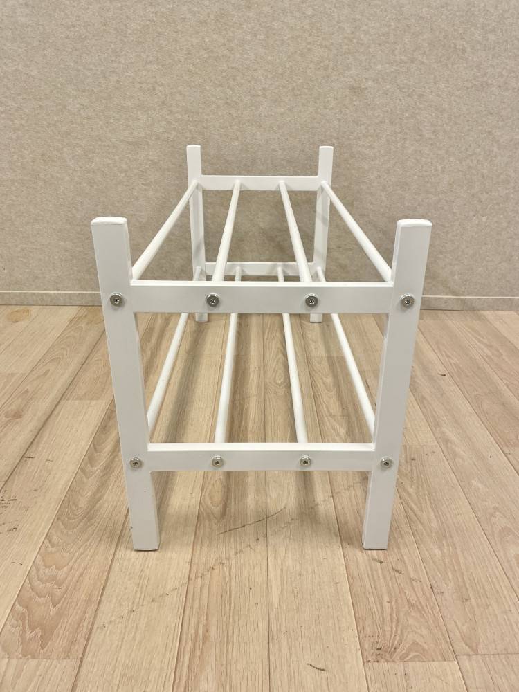 Valkoinen metallinen kenkähylly, leveys 75 cm.