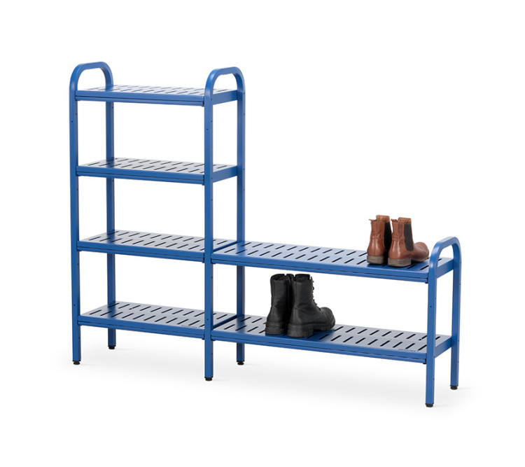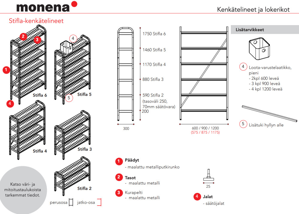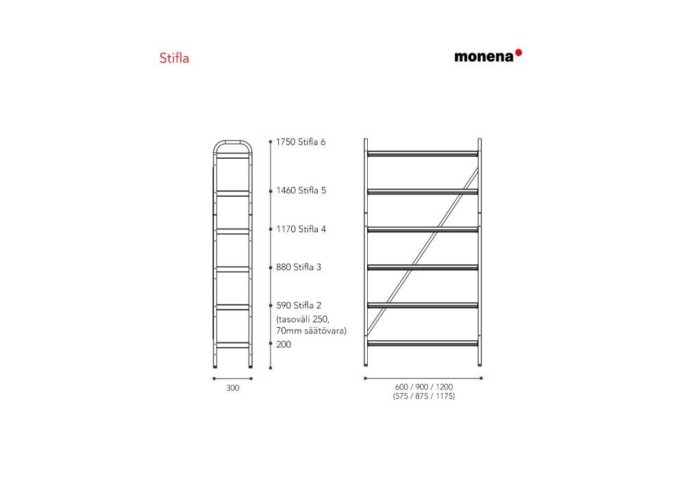 Monena Stifla on muunneltava kenkäteline julkisiin ja puolijulkisiin tiloihin, joissa tarvitaan kestävää ja helposti puhdistettavaa säilytysratkaisua. Teline on saatavilla useilla leveys- ja korkeusyhdistelmillä, ja kokonaisuus voidaan rakentaa perus- ja jatko-osista tilan ja kapasiteettitarpeen mukaan.