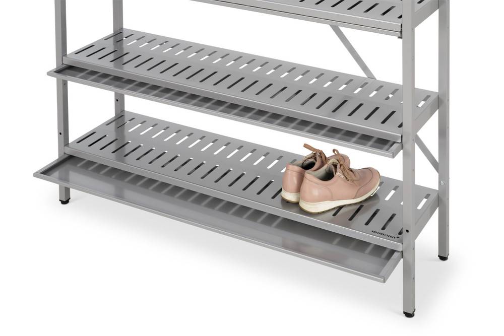 Rakenne perustuu metalliputkirunkoon ja perforoituihin metallihyllyihin. Jokaisessa hyllyssä on integroitu kurapelti, joka kerää kenkien mukana tulevan lian ja kosteuden ja estää sen valumisen alemmille tasoille tai lattialle. Hyllyjen korkeutta voidaan säätää, ja lisätuet mahdollistavat käytön myös raskaammissa kohteissa.