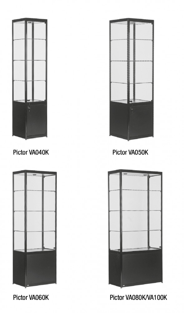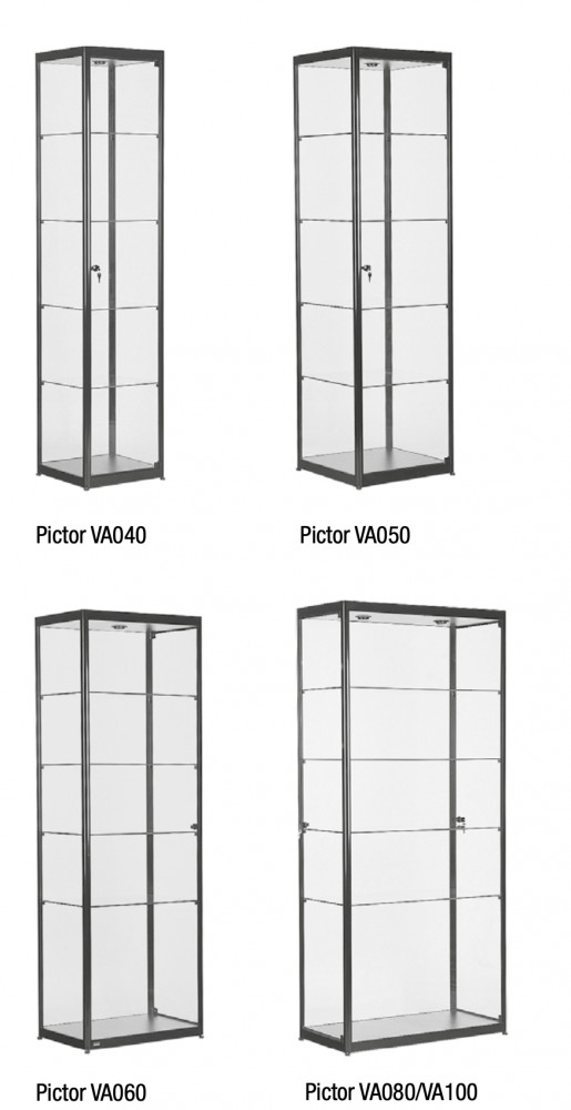 Saatavilla kolme erilaista mallia: Pictor VA pelkistettynä ja täysin avoimena vitriinikaappina, Pictor VAK lukittavalla alaosalla ja Pictor VAS liukuovella. Kaikissa malleissa on säädettävät lasihyllyt, sylinterilukko ja laadukkaat materiaalit, jotka tekevät niistä täydellisiä esineiden esillepanoon ja säilytykseen.