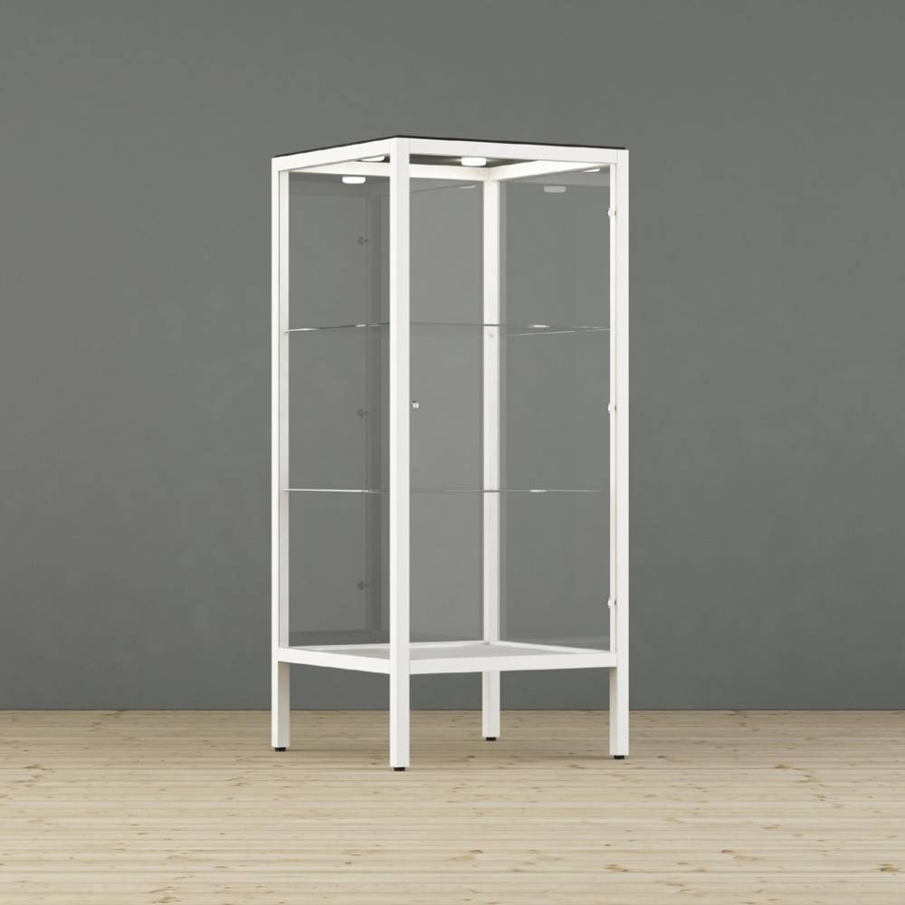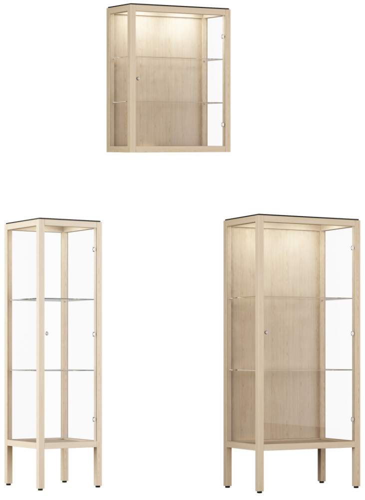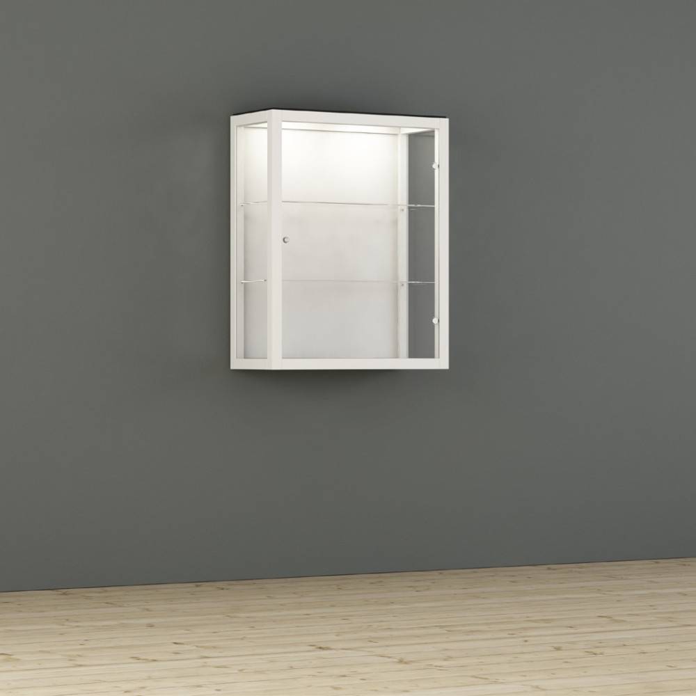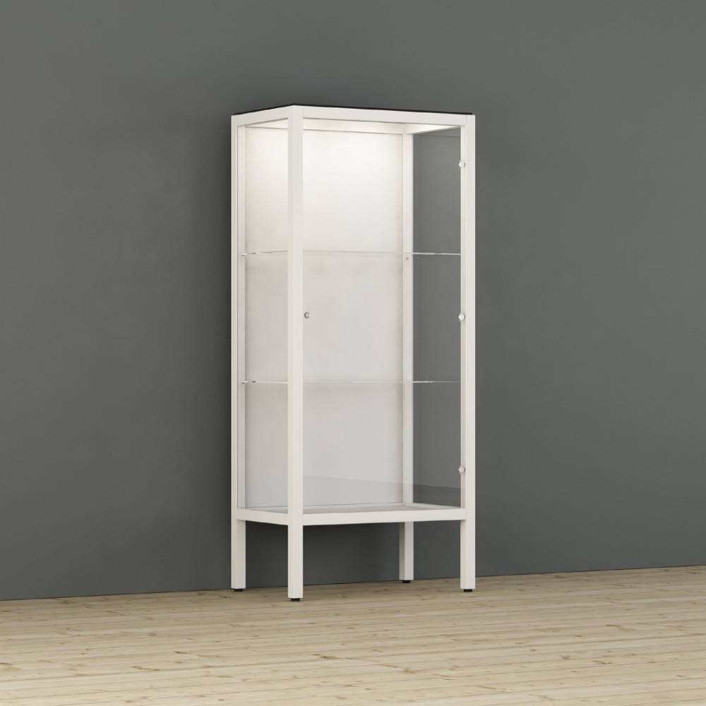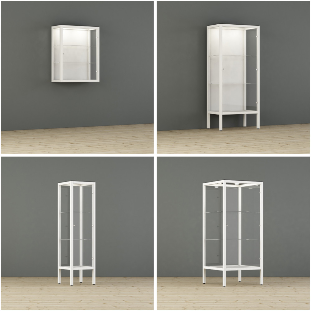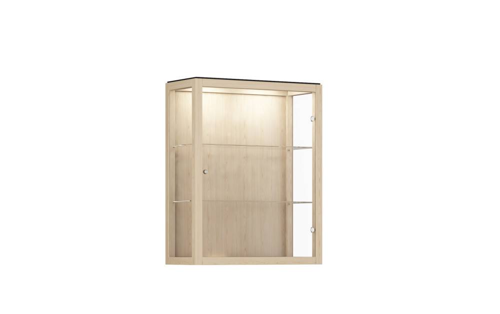 Kaappi toimitetaan vakiona integroidulla LED-valaistuksella (1–4 LED-spottia, 2,7 W), jossa on viikkoajastin. Valaistus korostaa esillepantavia tuotteita ja parantaa näkyvyyttä ilman erillisiä lisäasennuksia. Kaappi on saatavilla seinään kiinnitettävänä tai lattialla seisovana versiona, ja se soveltuu sekä yksittäiseksi kalusteeksi että osaksi laajempaa kokonaisuutta.