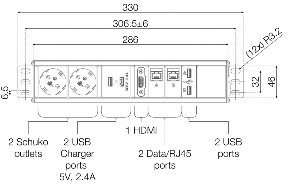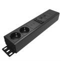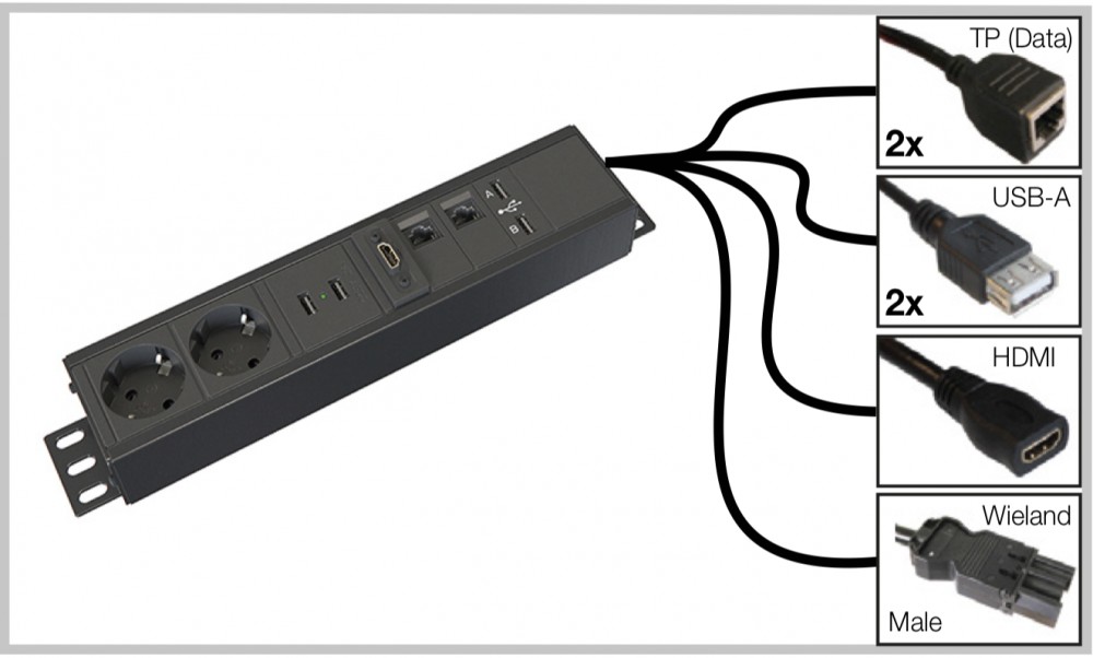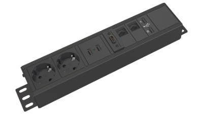 Johtoluukun sisälle sijoitettava pistorasia- ja datapaneeli, jossa 2 kpl sähköpistokkeita, 2 datapistoketta/LAN-porttia, 2 USB A-porttia, 2 USB A-laturia, 1 HDMI-portti. Värinä musta.