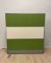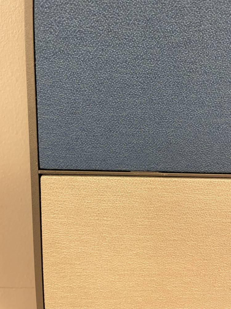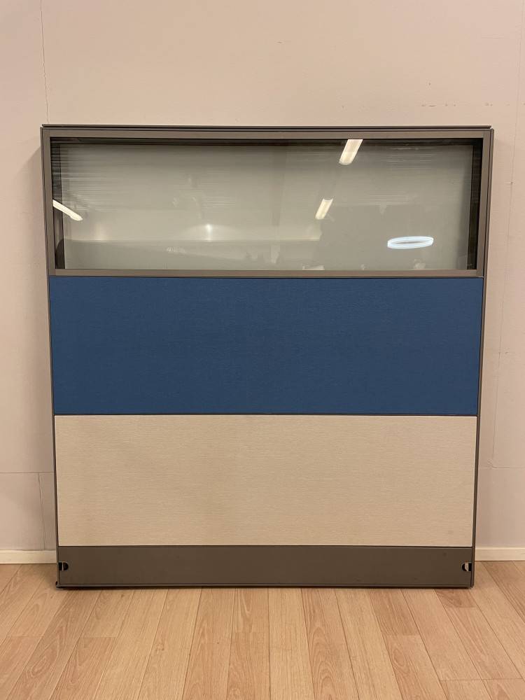 Korkeus 130 cm, Toisella puolella yksi paneli sininen, toinen puoli kokonaan harmaa.
