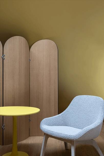 AD JUST on taitettava tilanjakaja, joka jakaa tilaa ja lisää yksityisyyttä erilaisissa sisäympäristöissä. Kolmiosainen rakenne ja kaareva muoto mahdollistavat joustavan käytön ja tilan muokkaamisen tarpeen mukaan.