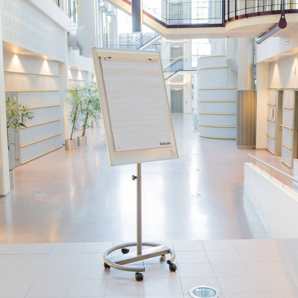 Liikuteltava lehtiötaulu, kun seinäpintaa on vähän mutta tarvitset siistin ja kestävän kirjoitusalustan. Kirjoituspinta on valkoista, magneettikäyttöön soveltuvaa e3-teräsemalia. Sopii erinomaisesti toimistoihin, koulutustiloihin ja projektikäyttöön.