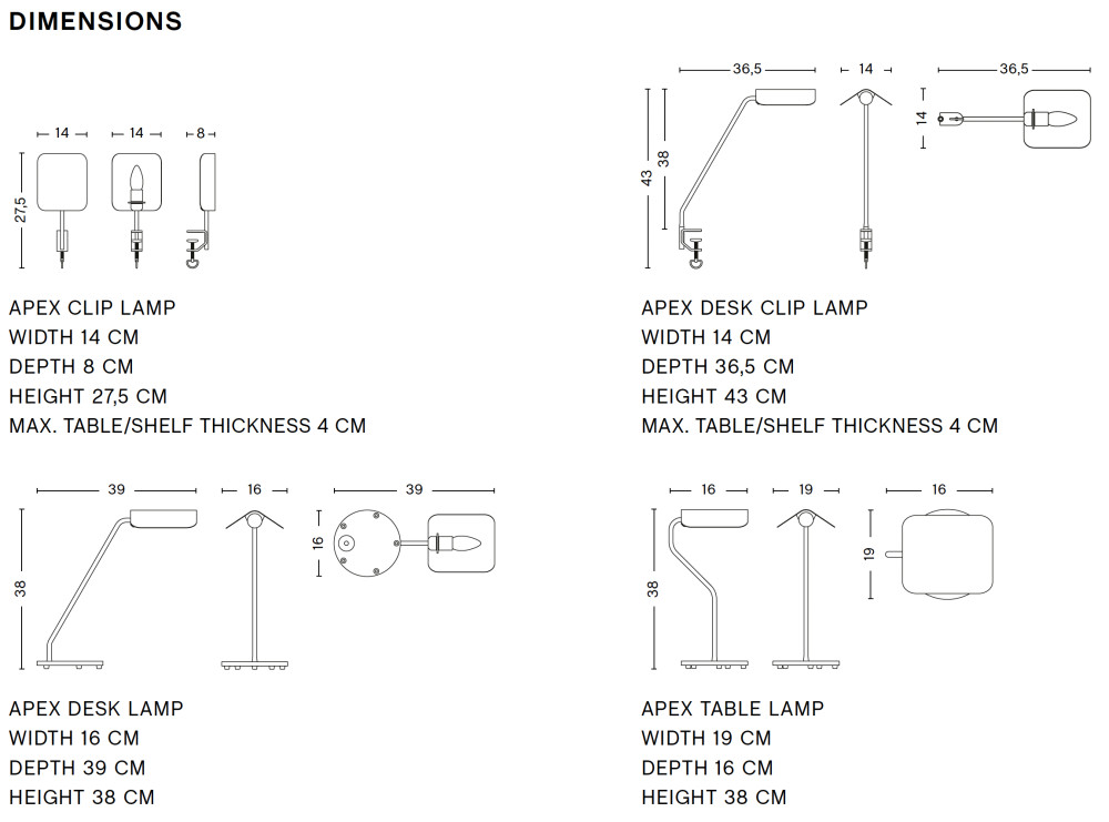 360 astetta kääntyvä varjostin ja siro, kulmikas runko tekevät Apexista monikäyttöisen valaisimen, joka sopii niin työpöydälle kuin yöpöydän valoksi. Valaisin on CE-merkitty ja testattu tiukkojen eurooppalaisten sähköturvallisuus- ja EMC-standardien mukaisesti. Apex-sarja koostuu neljästä mallista: Clip Lamp, Desk Clip Lamp, Desk Lamp ja Table Lamp – kaikki saatavilla eri väreissä, kysy näistä lisää!