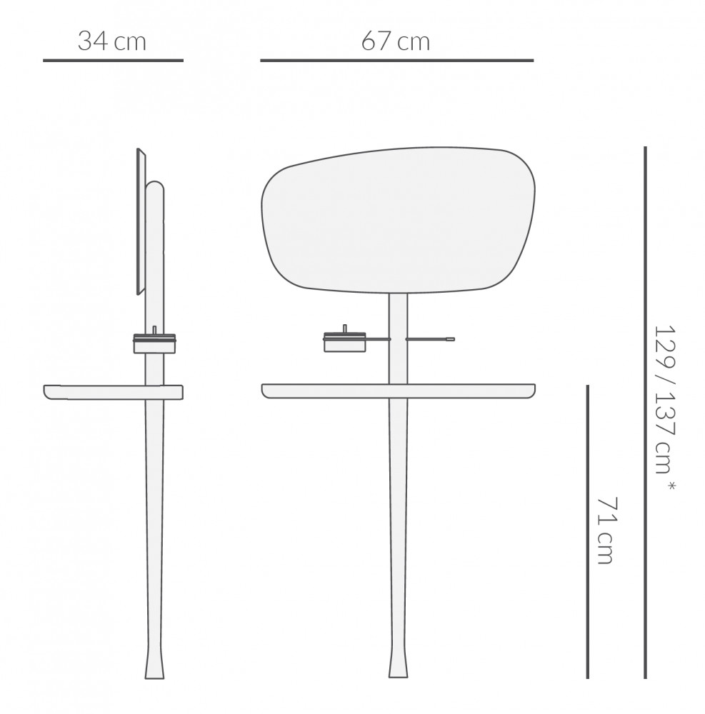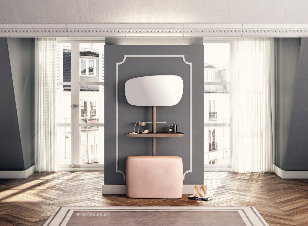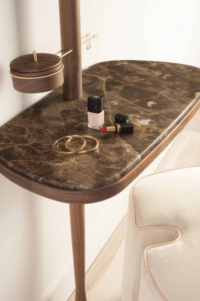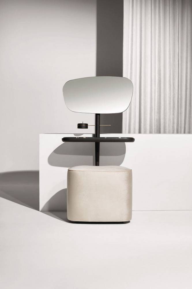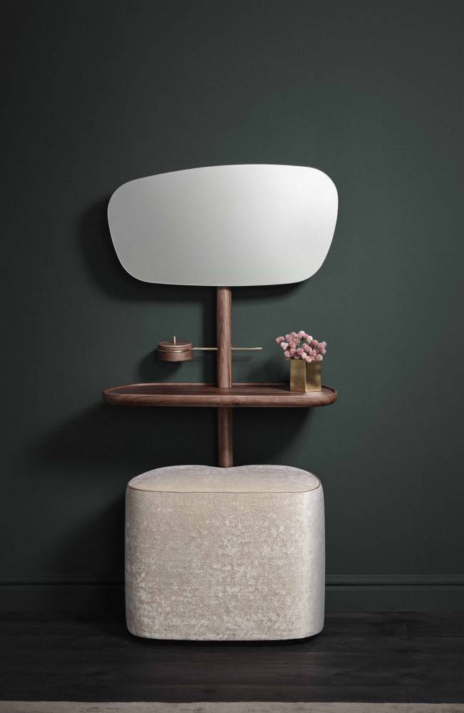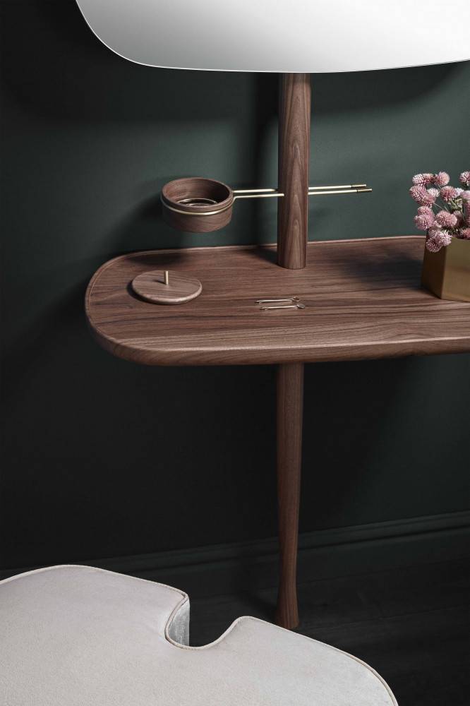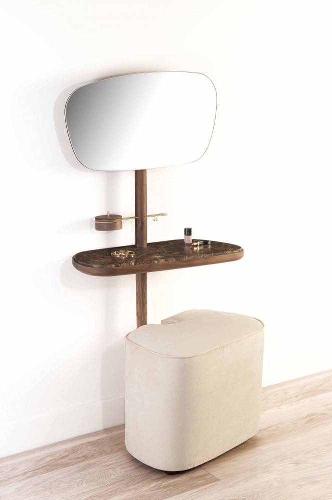 NOMON TOCADOR on tyylikäs peilipöytä. Peilin voi asettaa kahteen eri korkeuteen. Pöytätaso on puuta tai marmoria. Marmorin värivaihtoehtoja on kolme. Peilipöydän puuosat ovat pähkinä massiivipuuta tai mustaksi petsattua saarnia. Peilipöytään lisävarusteena saatavissa istuin/rahi. Istuin on verhoiltu sametilla, värivaihtoehtoja on beige, roosa ja harmaa. Pyydä tarjous!