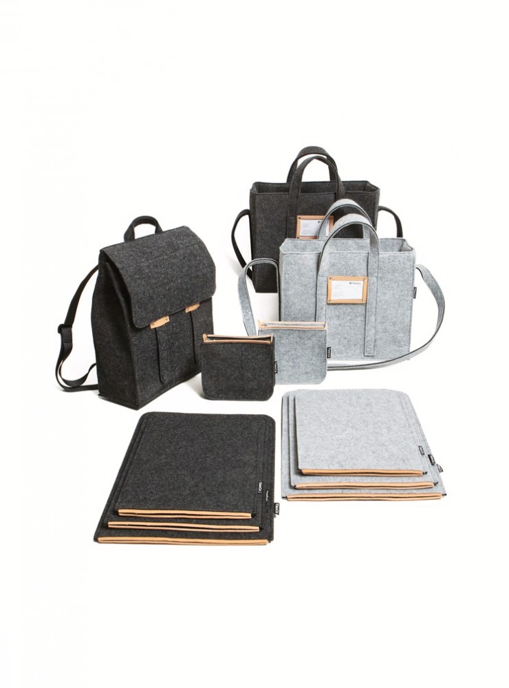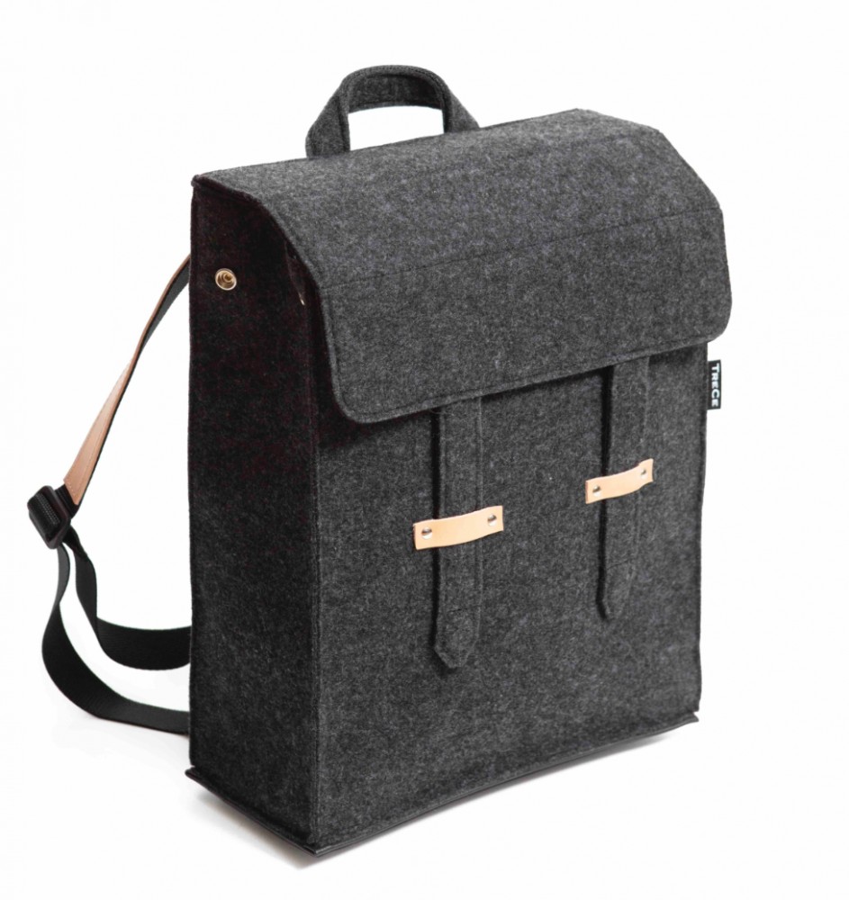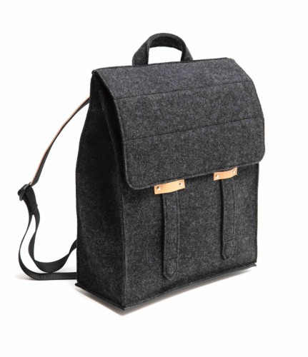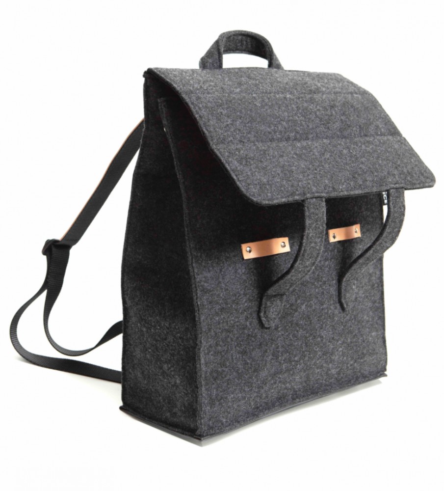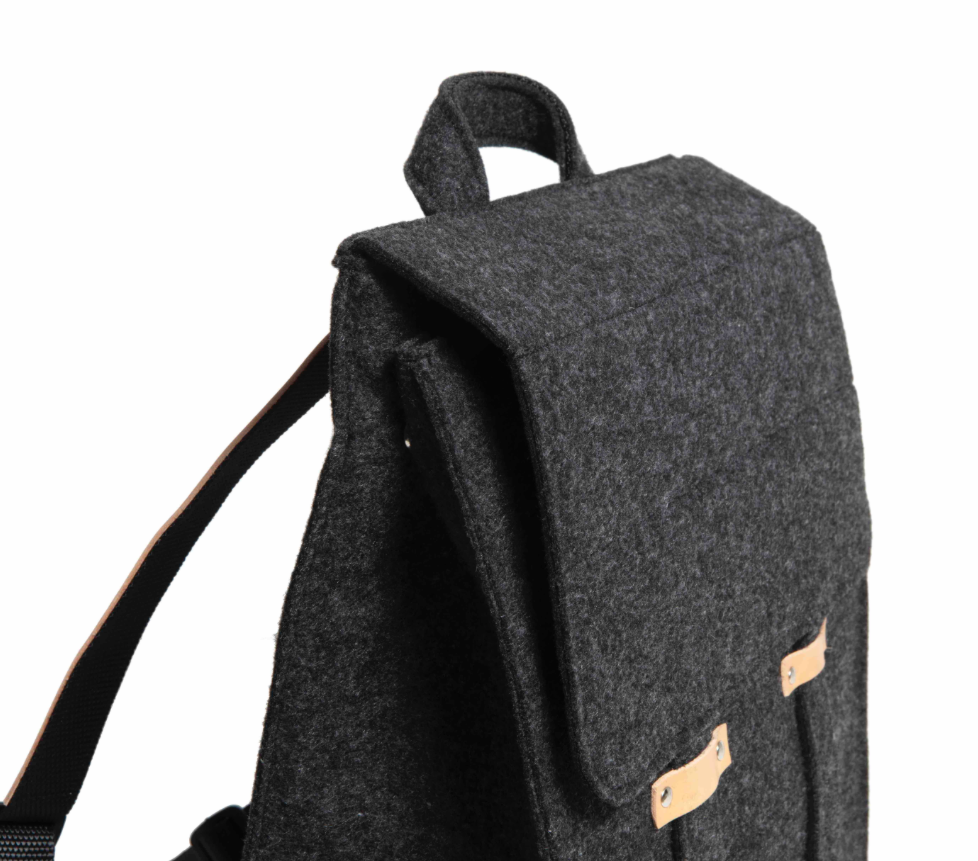 OFFICE BACKPACK on valmistettu neulotusta polyesterihuovasta, 7% villaa, yksityiskohdat käsittelemätöntä nahkaa, jo patinoituu kauniisti ajan myötä.